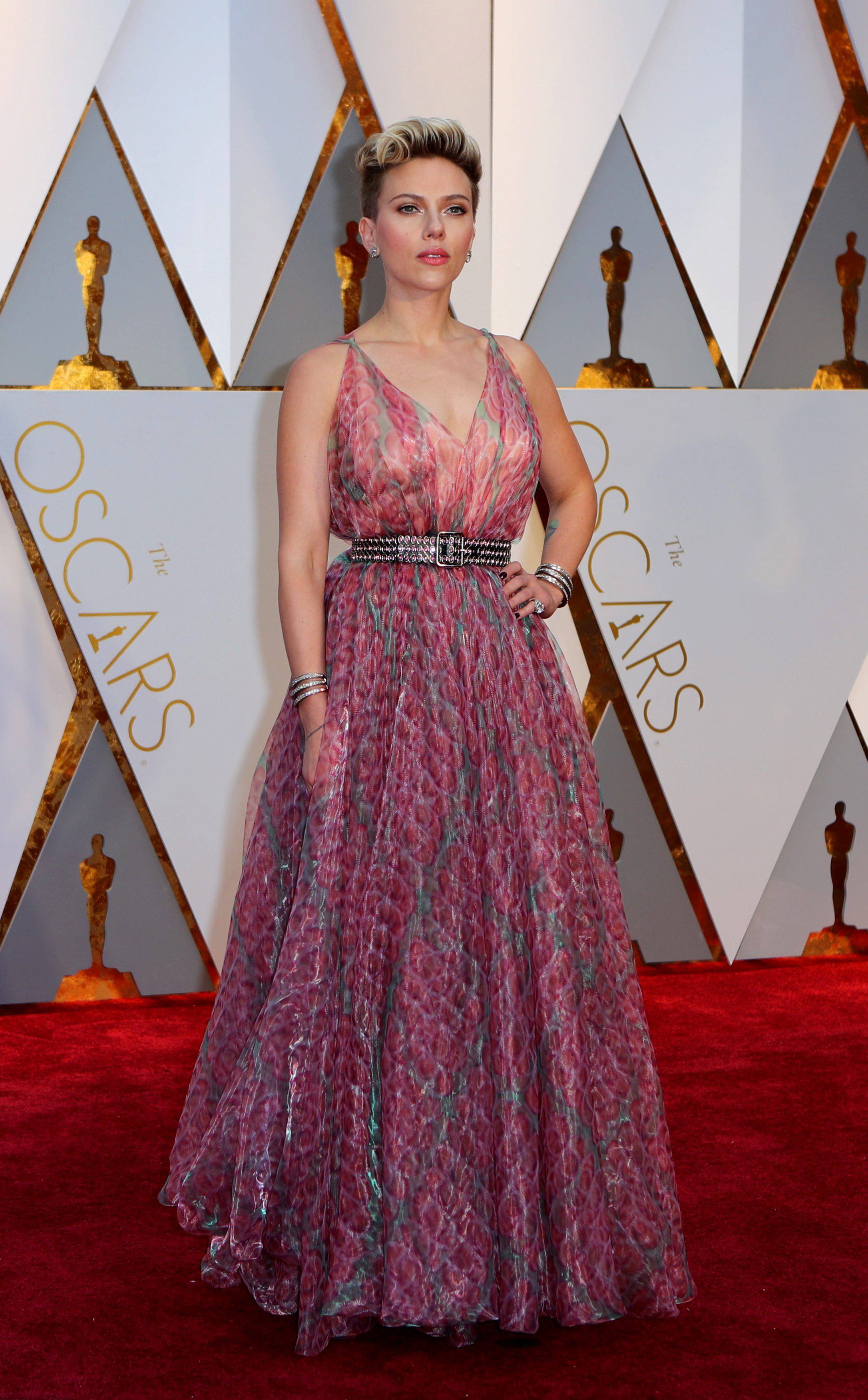 Muy colorido pero nada acertado el vestido elegido por Scarlett, que acompañó con un cinturón innecesario.