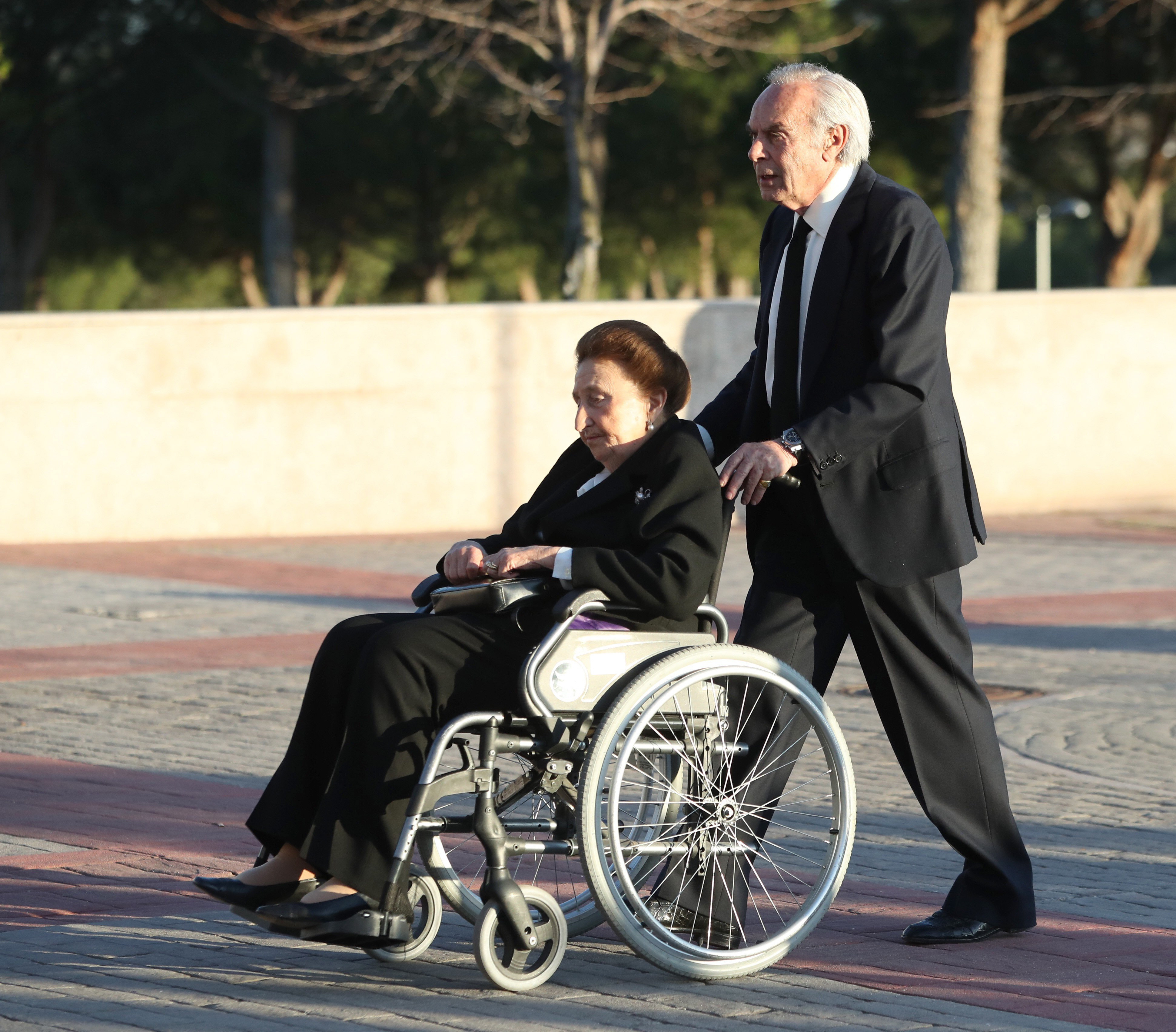 Los reyes eméritos acudieron al Tanatorio de La Paz de Madrid donde asistieron a una misa funeral por la infanta Alicia de Borbón-Parma, fallecida ayer poco después de mediodía en su domicilio de Madrid.