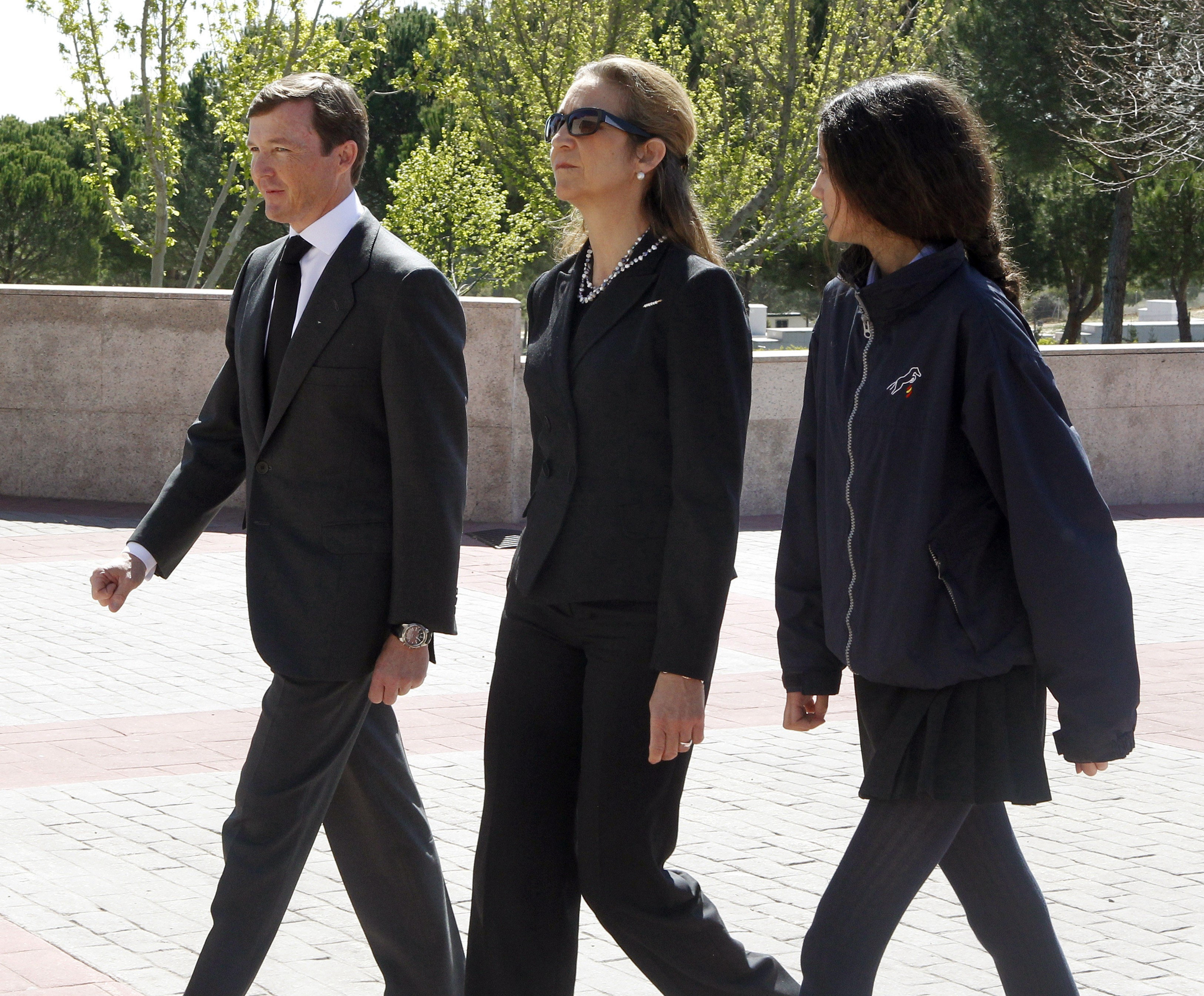 La infanta Elena y su hija Victoria Federica, son recibidas por Pedro de Borbón-Dos Sicilias, duque de Calabria, a su llegada al Tanatorio de La Paz.