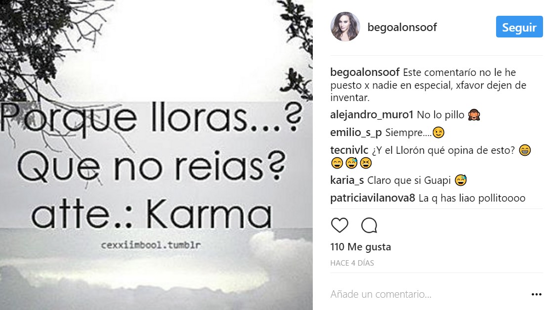 Esta semana, Begoña volvía a ser noticia tras la publicación de una frase en sus redes sociales que muchos dijeron que iba dirigida a su ex, David Bustamante, a raíz de su separación de Paula Echevarría. Según ella, "este comentario no lo he puesto por nadie en especial. Por favor, dejen de inventar".