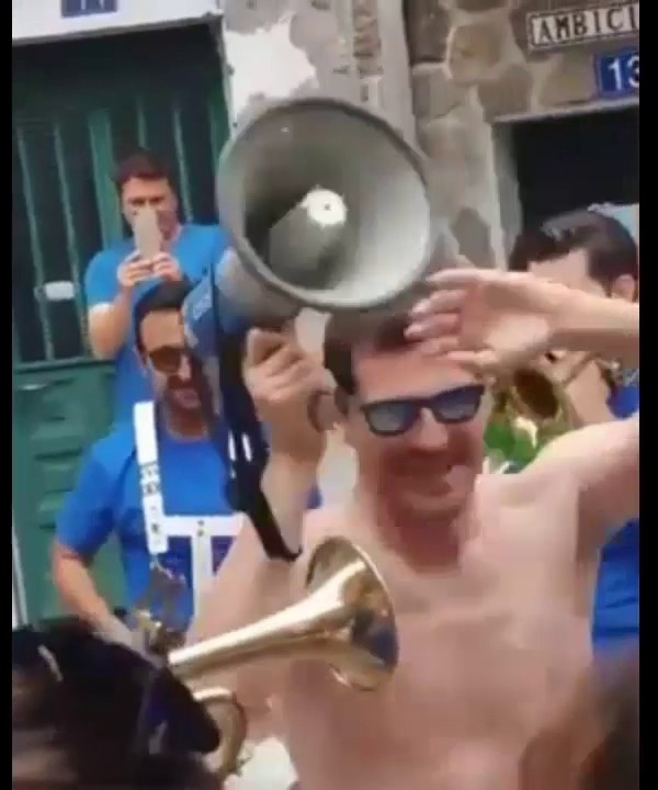 Con gafas de sol, megáfono en mano y sin camiseta, Iker Casillas animó a la juventud de su pueblo y mostró su faceta más divertida bailando todas las canciones que interpretaba la charanga.