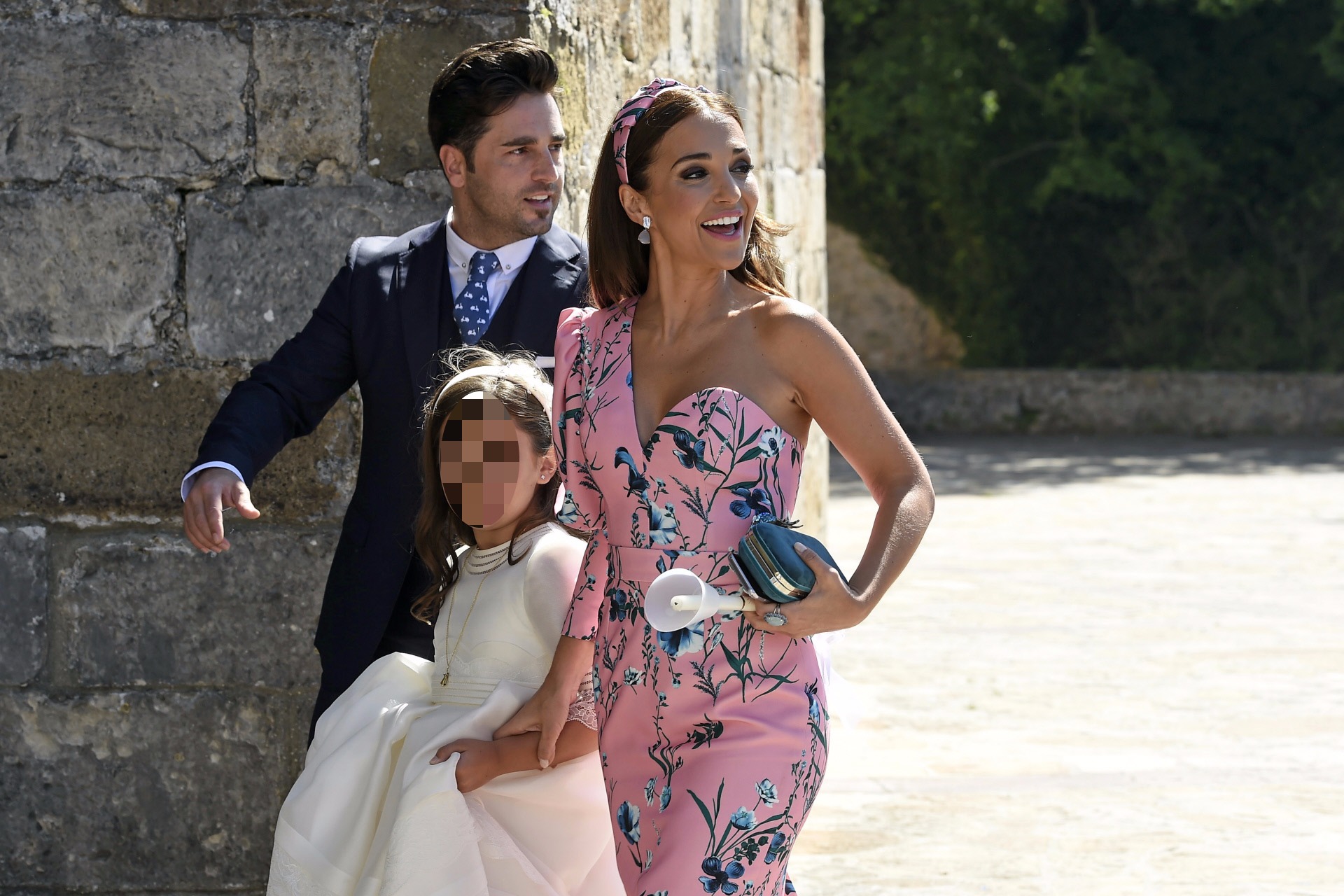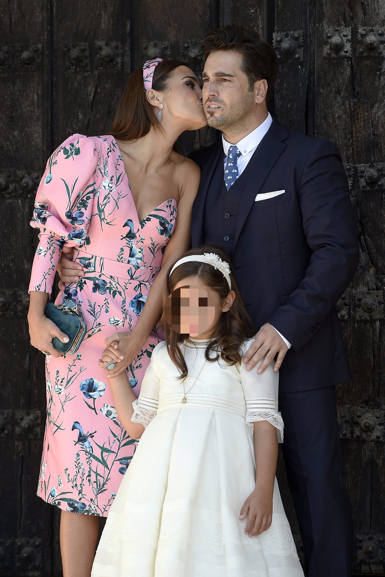 Paula Echevarría y David Bustamante posando orgullosos con su hija a las puertas de la iglesia de Santa María de los Ángeles.