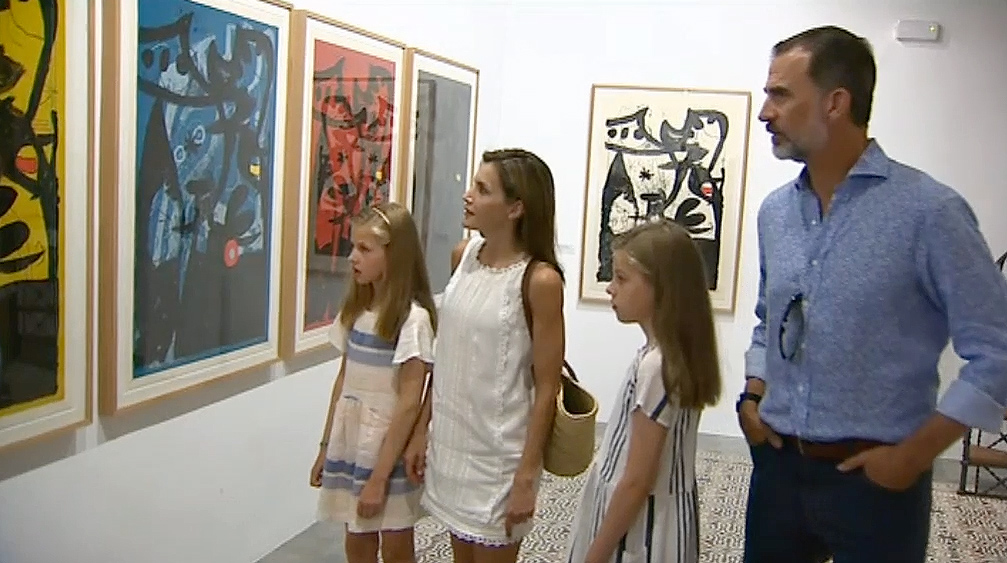 Durante casi una hora, la Familia Real, que disfruta de sus vacaciones estivales en la isla balear, ha podido contemplar medio centenar de obras de Picasso y Miró, y ha tenido como guías a los nietos de los dos grandes artistas.