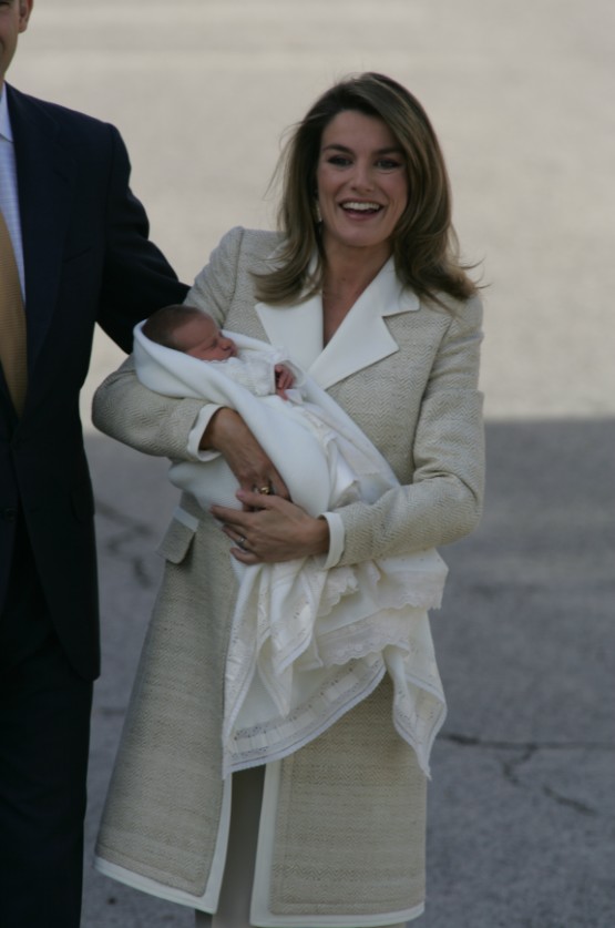 Letizia dio a luz a Leonor de Todos los Santos de Borbón y Ortiz, su primogénita, el 31 de octubre de 2005 en la Clínica Ruber de Madrid. La infanta nació por cesárea a las 01:46 horas, después de que los médicos comprobaran que el trabajo de parto no progresaba. La niña pesó 3,540 kilos y midió 47 centímetros y todo salió a la perfección.