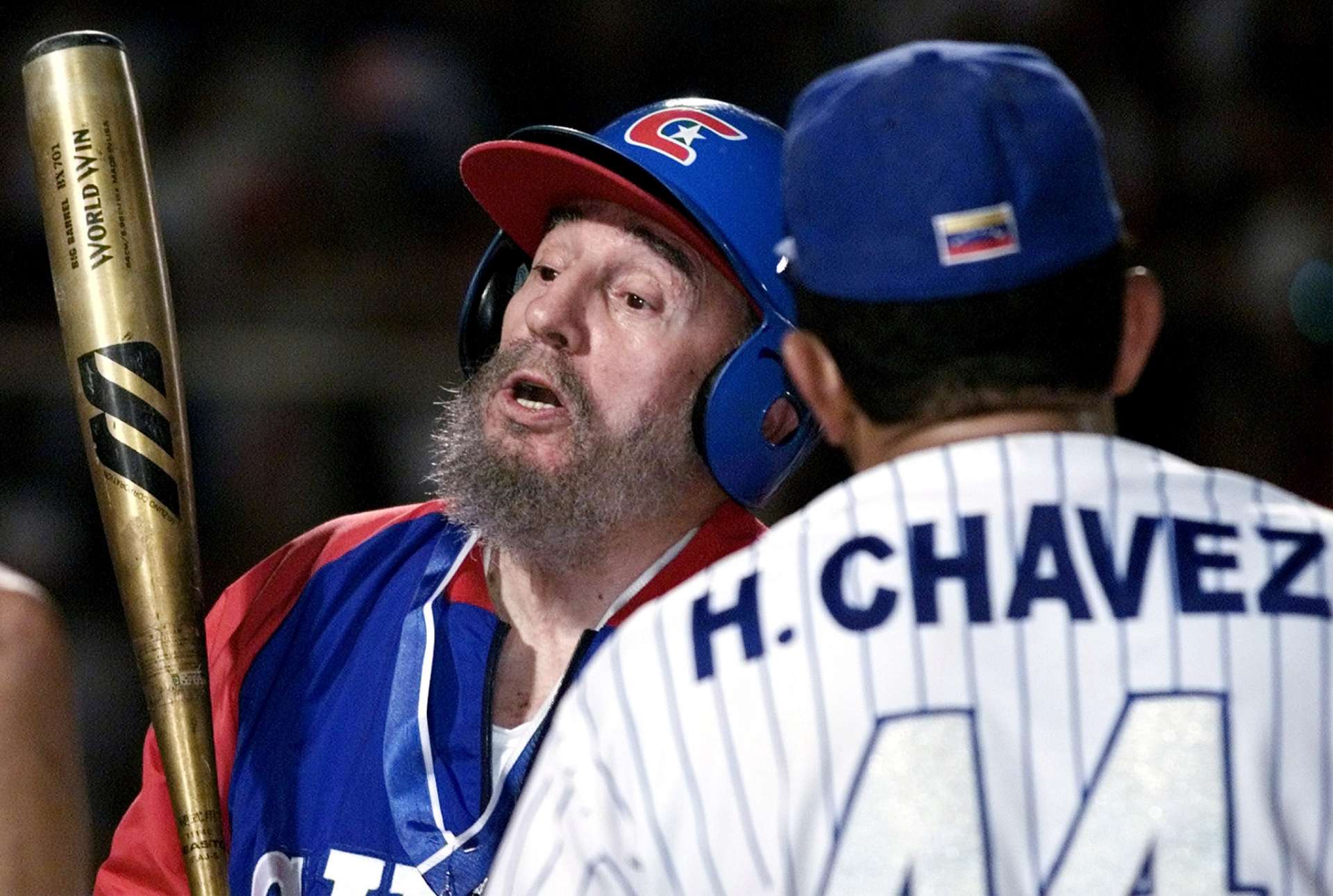 Fidel Castro jugando al béisbol con Hugo Chávez en Barquisimeto, Venezuela, en octubre del año 2000.