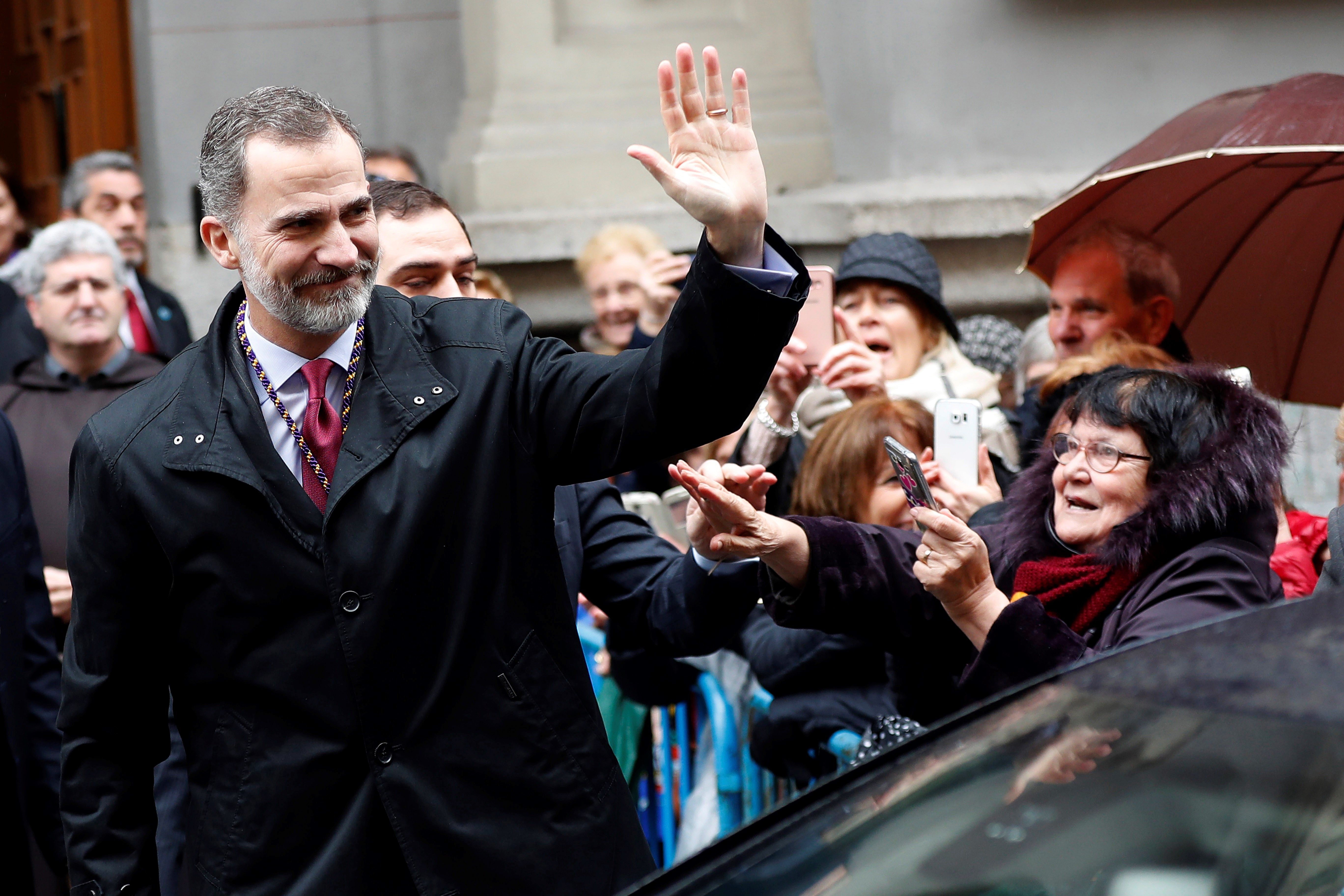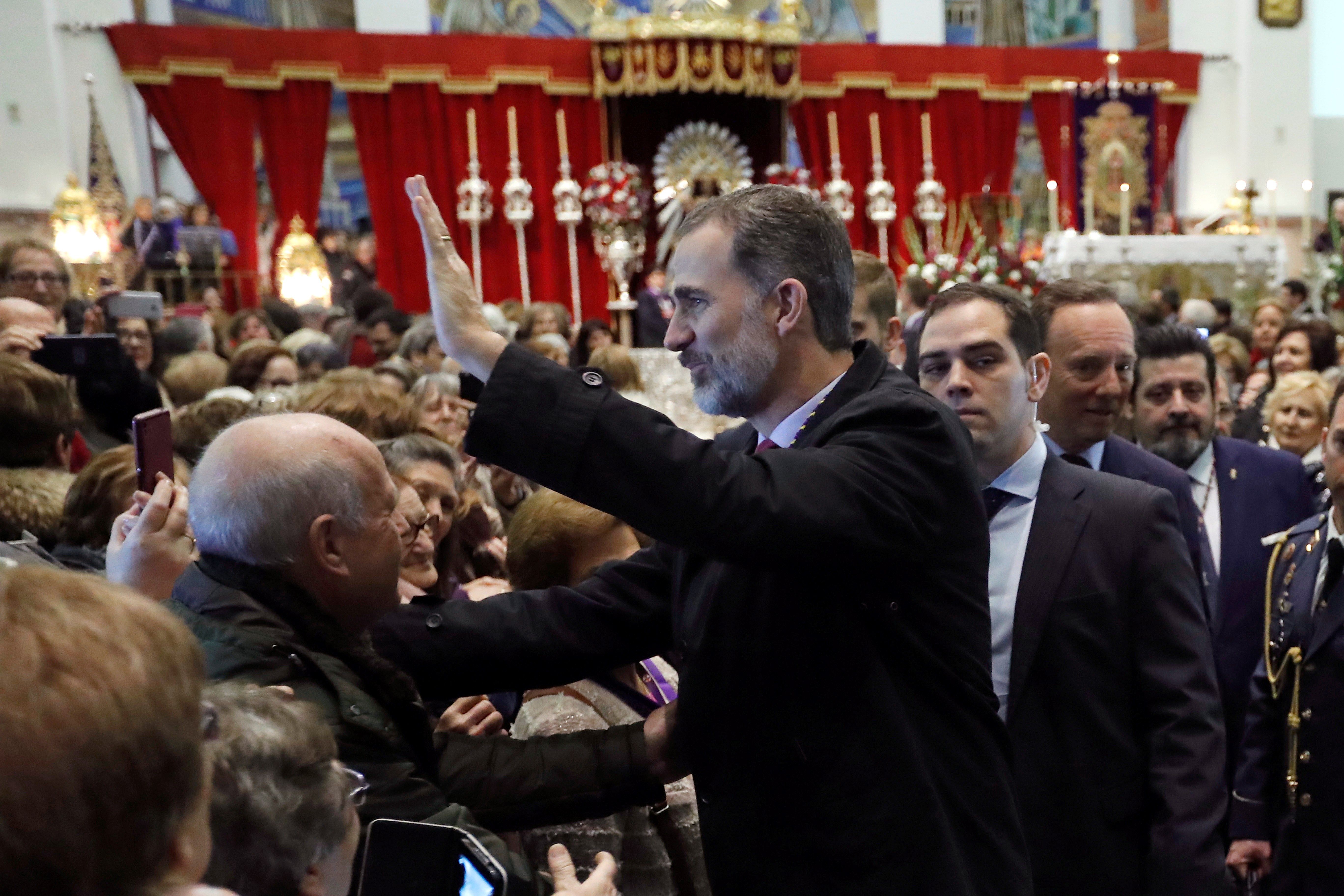 Felipe VI saluda a los fieles congregados en la basílica de Jesús de Medinaceli, en su primera actividad pública fuera de la Zarzuela desde que regresó de Barcelona, para cumplir la tradición anual de la Familia Real de rezar y venerar la imagen del Cristo de Medinaceli. EFE