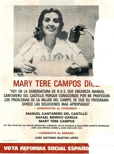 María Teresa Campos fue antes 'Mary Tere', una periodista malagueña de 35 años candidata al Congreso por Málaga en el partido Reforma Social de España (RSE). Su profesión le permitió conocer "los problemas de las mujeres en el campo" y decidió comprometerse con la igualdad de derechos. En 2012, el Archivo Provincial de Málaga rescató este cartel y otros tantos para una exposición dedicada a la lucha de la mujer.