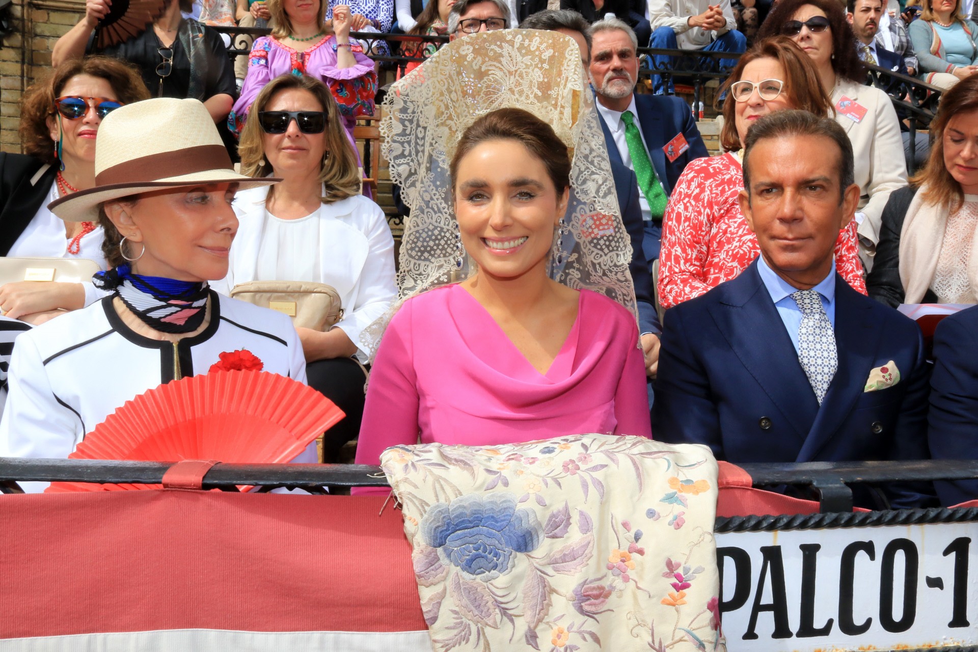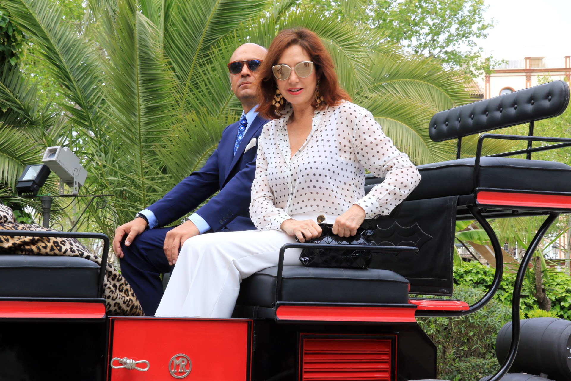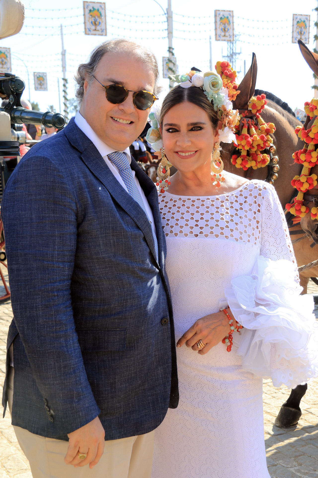 La reina de las mañanas de Telecinco, Ana Rosa Quintana, se desplazó al sur de España junto a su marido, con el que llegó en calesa al recinto.
