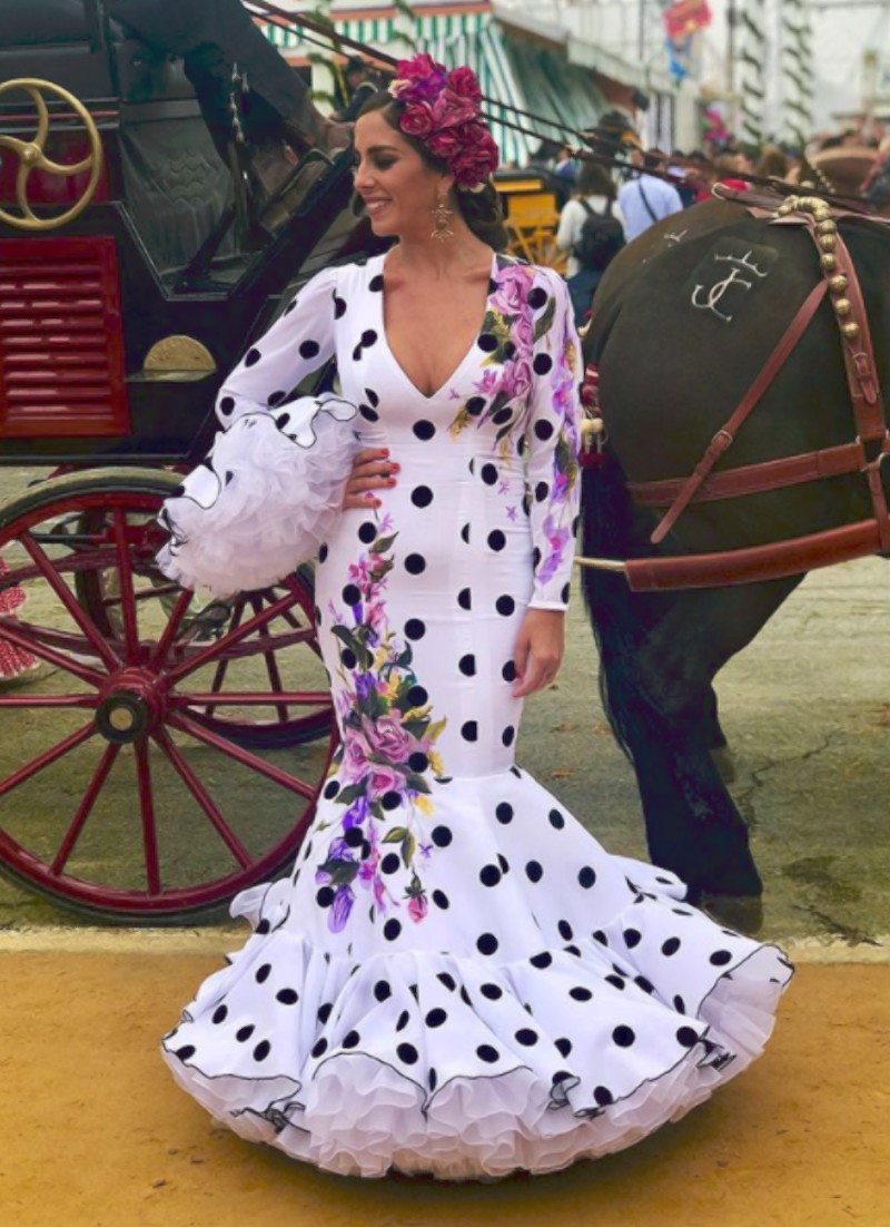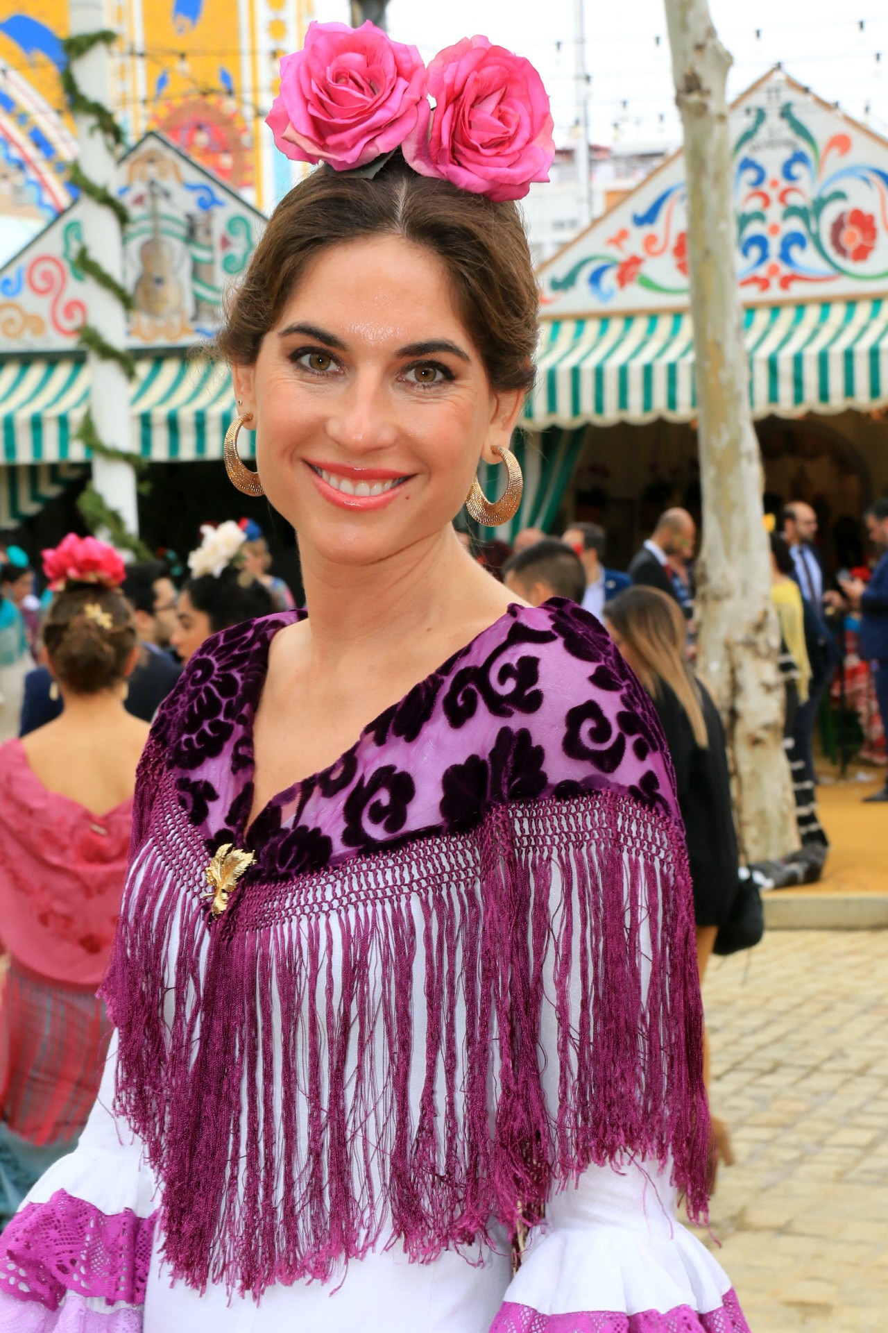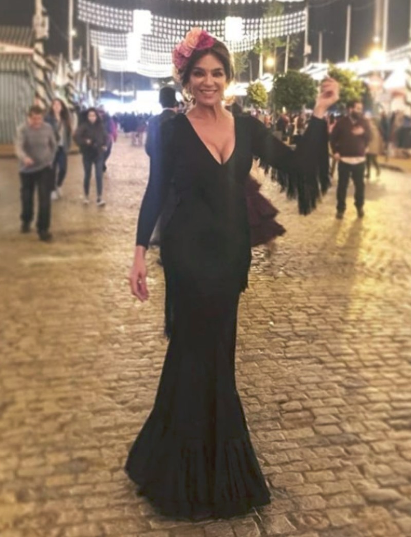 La modelo Raquel Revuelta luciendo su traje flamenco en el ferial de Sevilla.