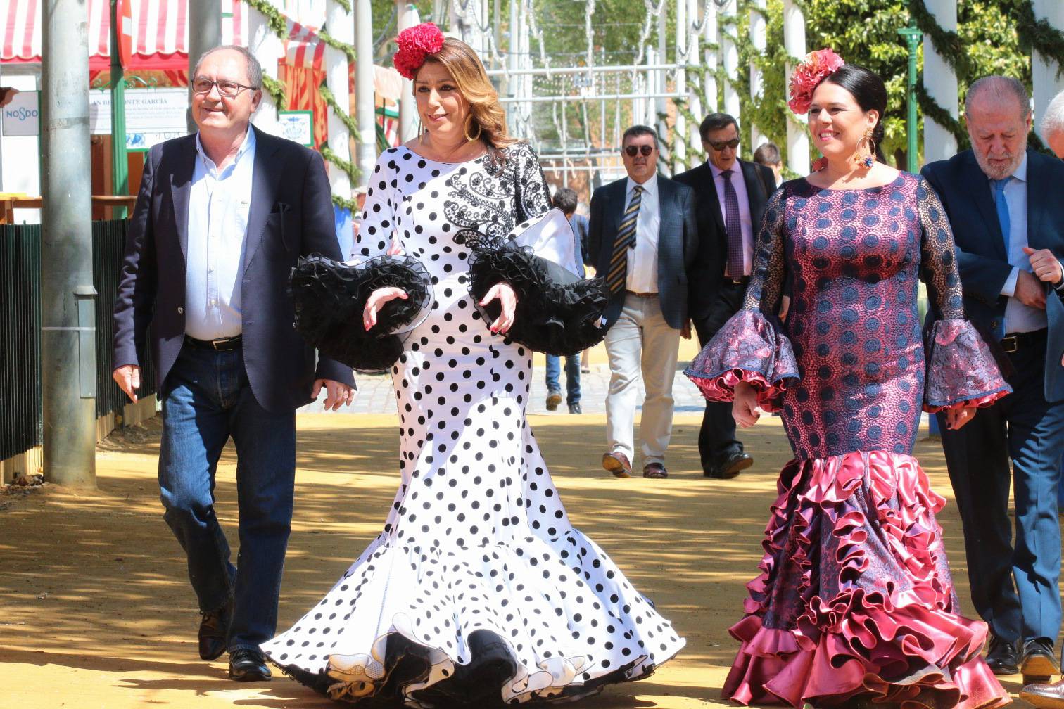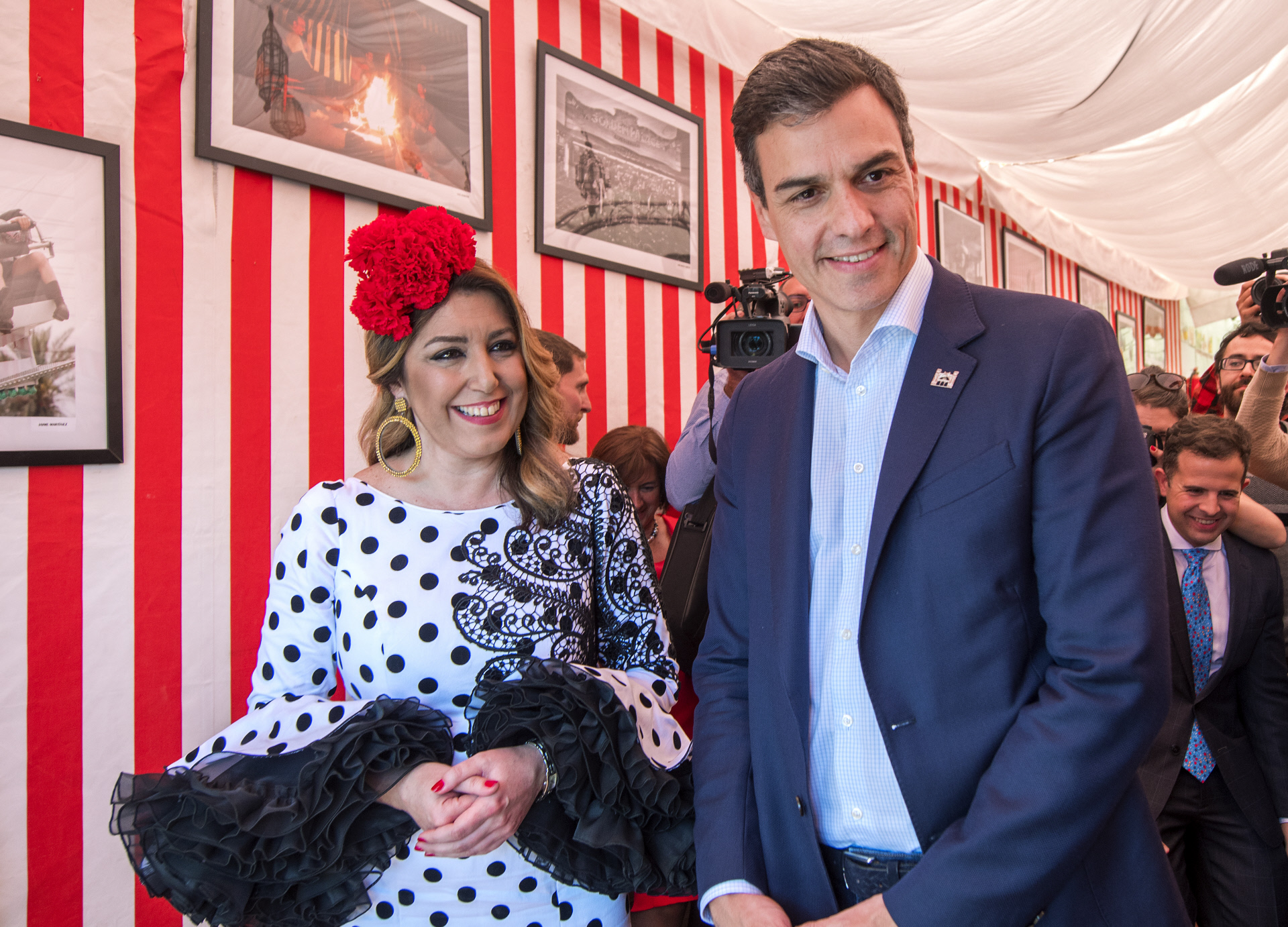 Pedro Sánchez y Susana Díaz se saludaron en la caseta de la Asociación de la Prensa de Sevilla, donde asistieron juntos a la entrega de los tradicionales 'claveles'.