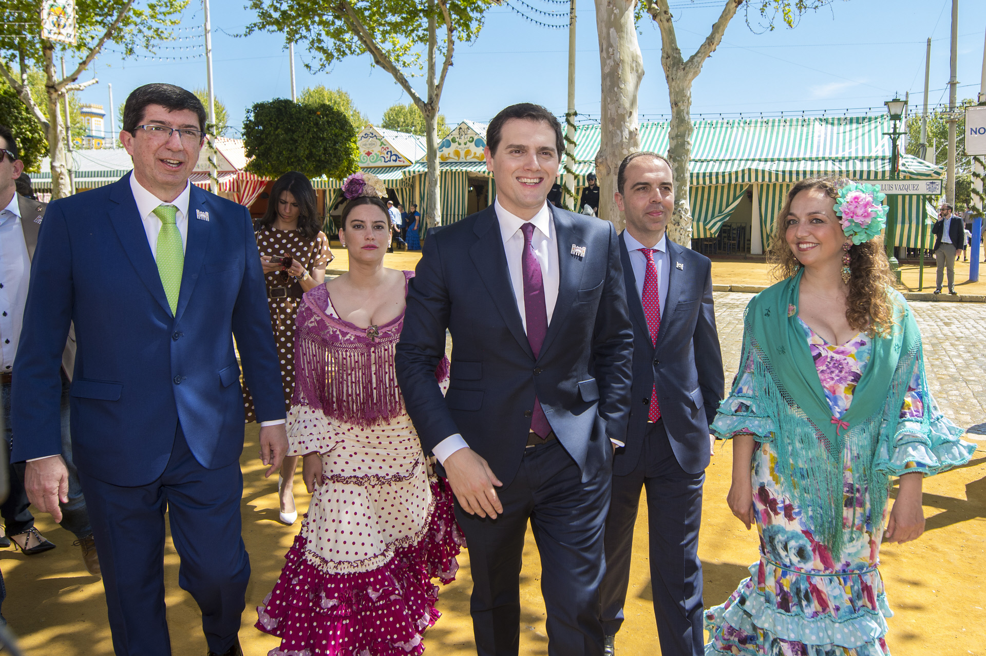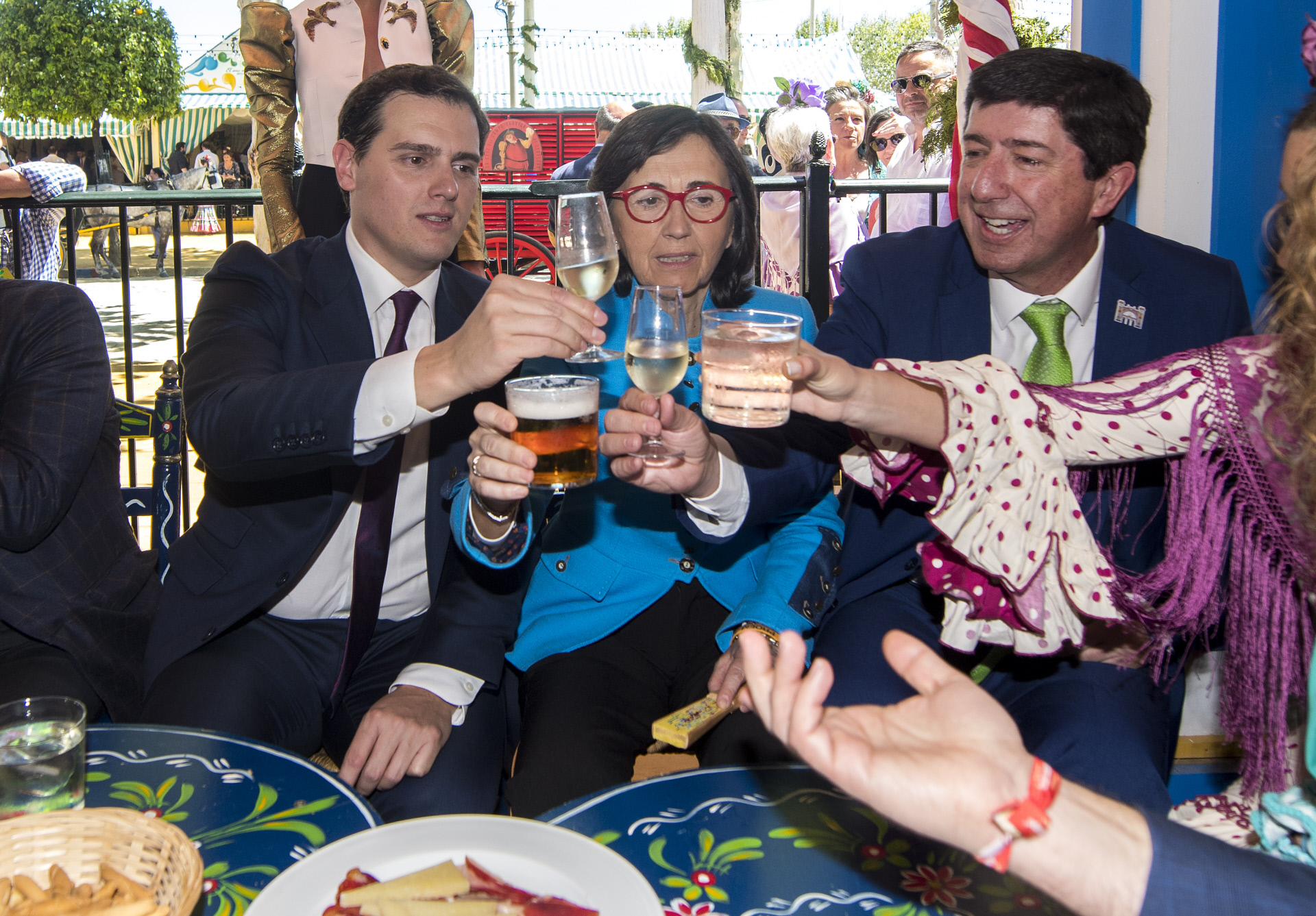 Albert Rivera con los políticos Juan Marín y Rosa Aguilar en la Feria de Abril de Sevilla.