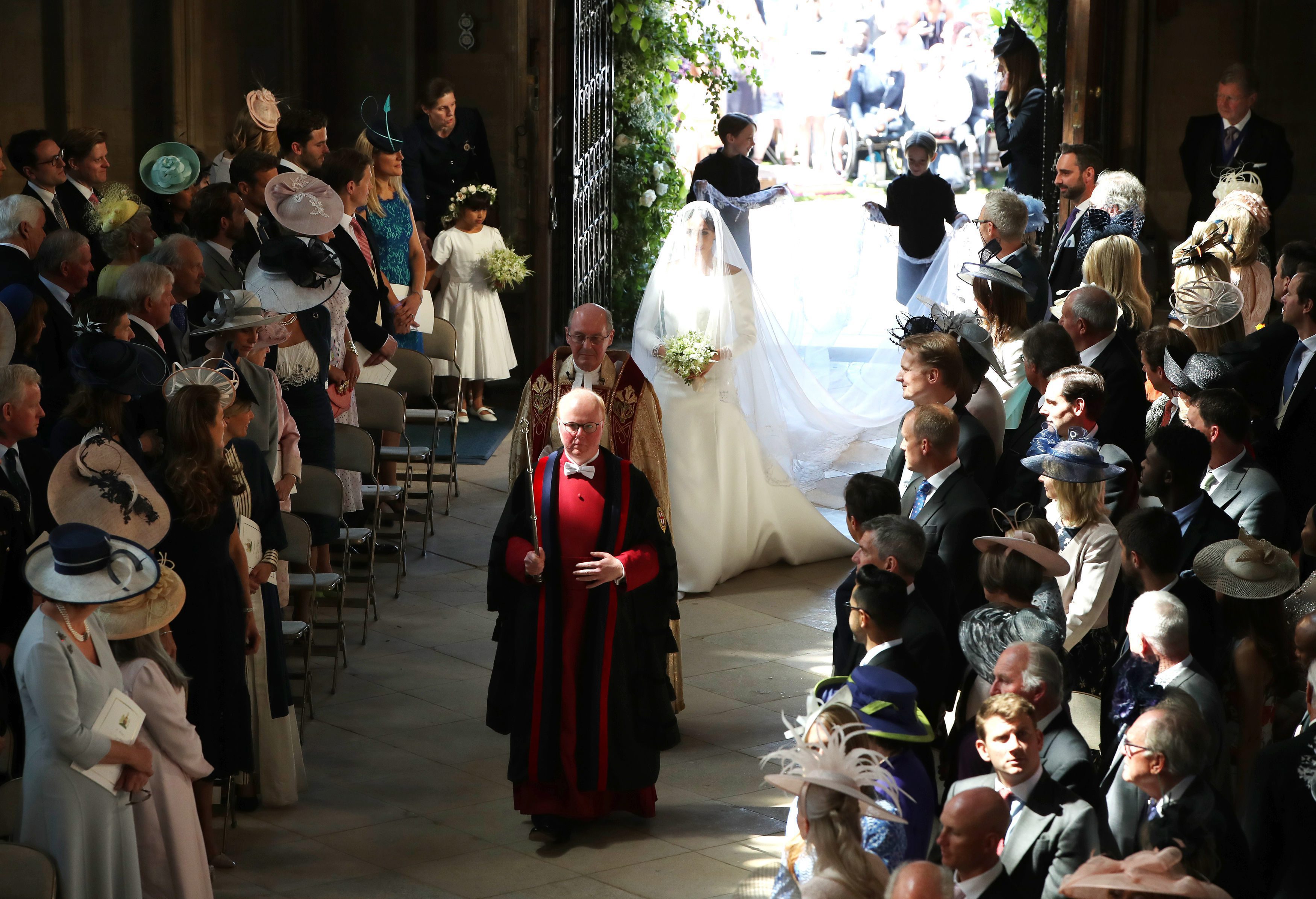 La prometida de Enrique entró sola en la capilla acompañada por diez niños que hacen de damas de honor y pajes, entre ellos el príncipe Jorge y la princesa Carlota, hijos de los duques de Cambridge, hasta que el príncipe Carlos, heredero al trono, la tomó del brazo para conducirla hasta el altar.