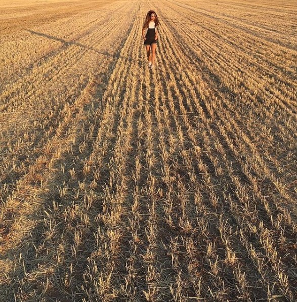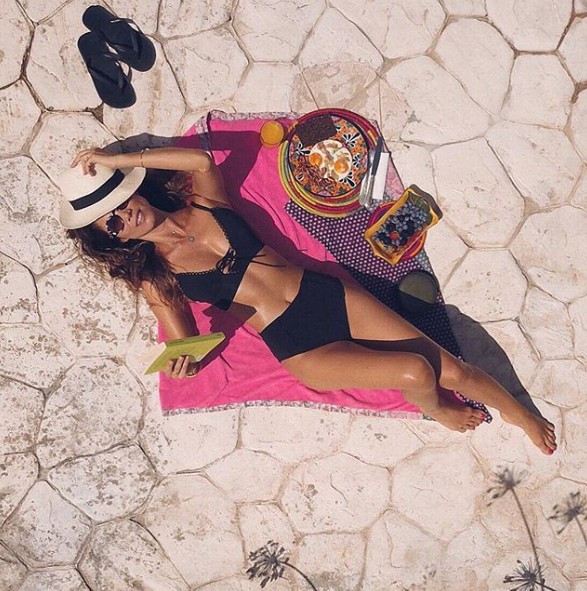 Pero no ha sido la única imagen que ha incendiado las redes, pues recientemente ha subido otra fotografía muy veraniega hecha con un dron, posando tumbada con un espectacular bikini negro de tiro alto, con sombrero, gafas de sol y desayunando.