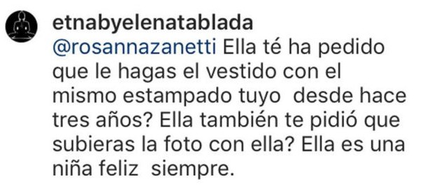 La imagen fue tomada en la Feria de Almería, con Ella y Rosanna vestidas a juego en plena fiesta. Muchos seguidores ya recriminaron a la modelo el vestir con tacones a la niña, y sobre todo el hecho de que ambas vistieran a juego (cuando Rosanna no es la madre de Ella). Zanetti explicó desde su cuenta de Instagram que "cada quien interpreta lo que quiere, no lo que es". "Es mi tercer año yendo a la feria con Ella y desde entonces me había pedido un vestido igual al mío, esta vez fue posible y la chiquitica estaba súper feliz".