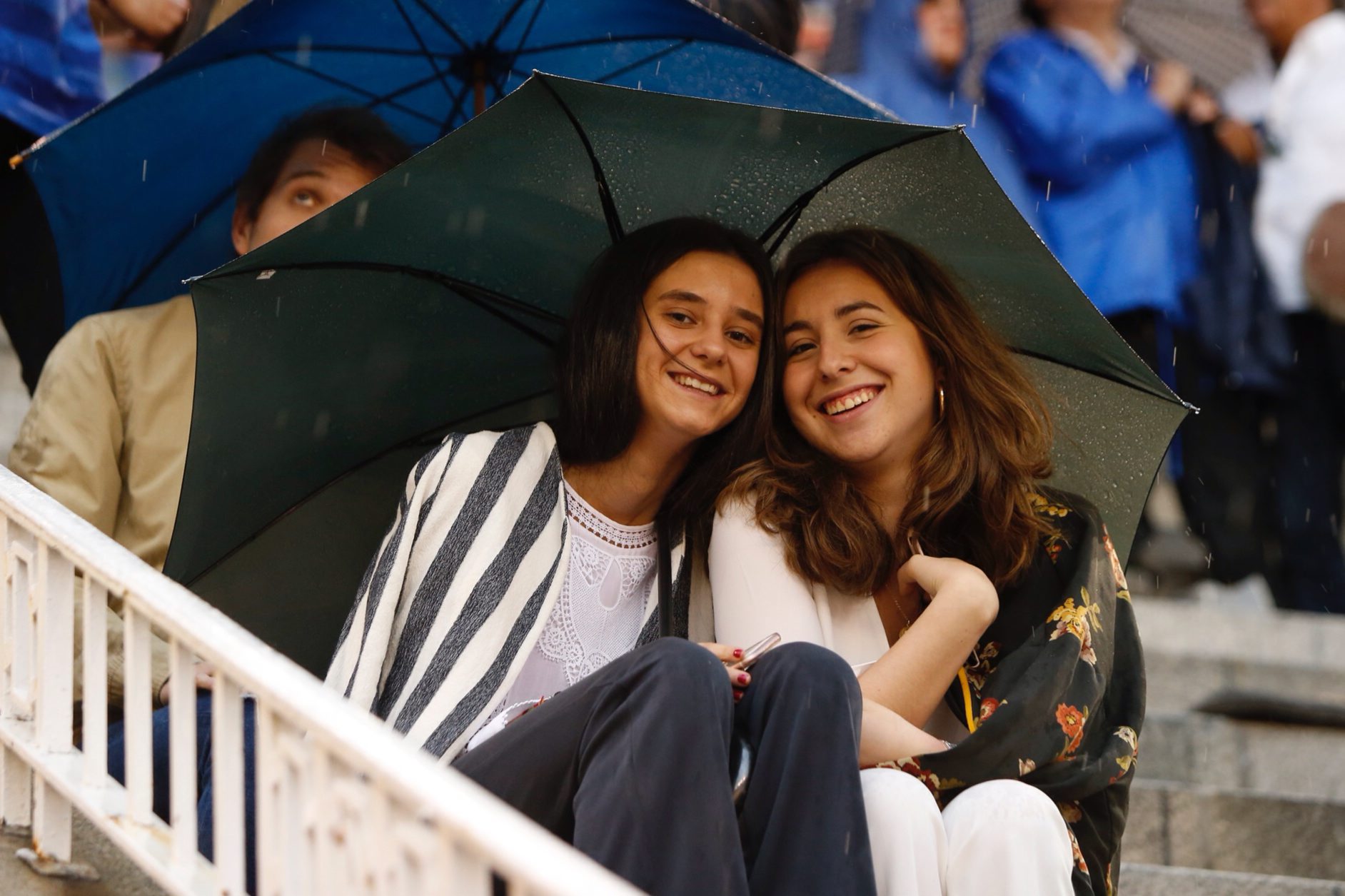 No se pierde una cita de San Isidro en Madrid. Una divertida imagen junto una amiga en la Plaza de Toros de las Ventas, resguardándose de la lluvia.