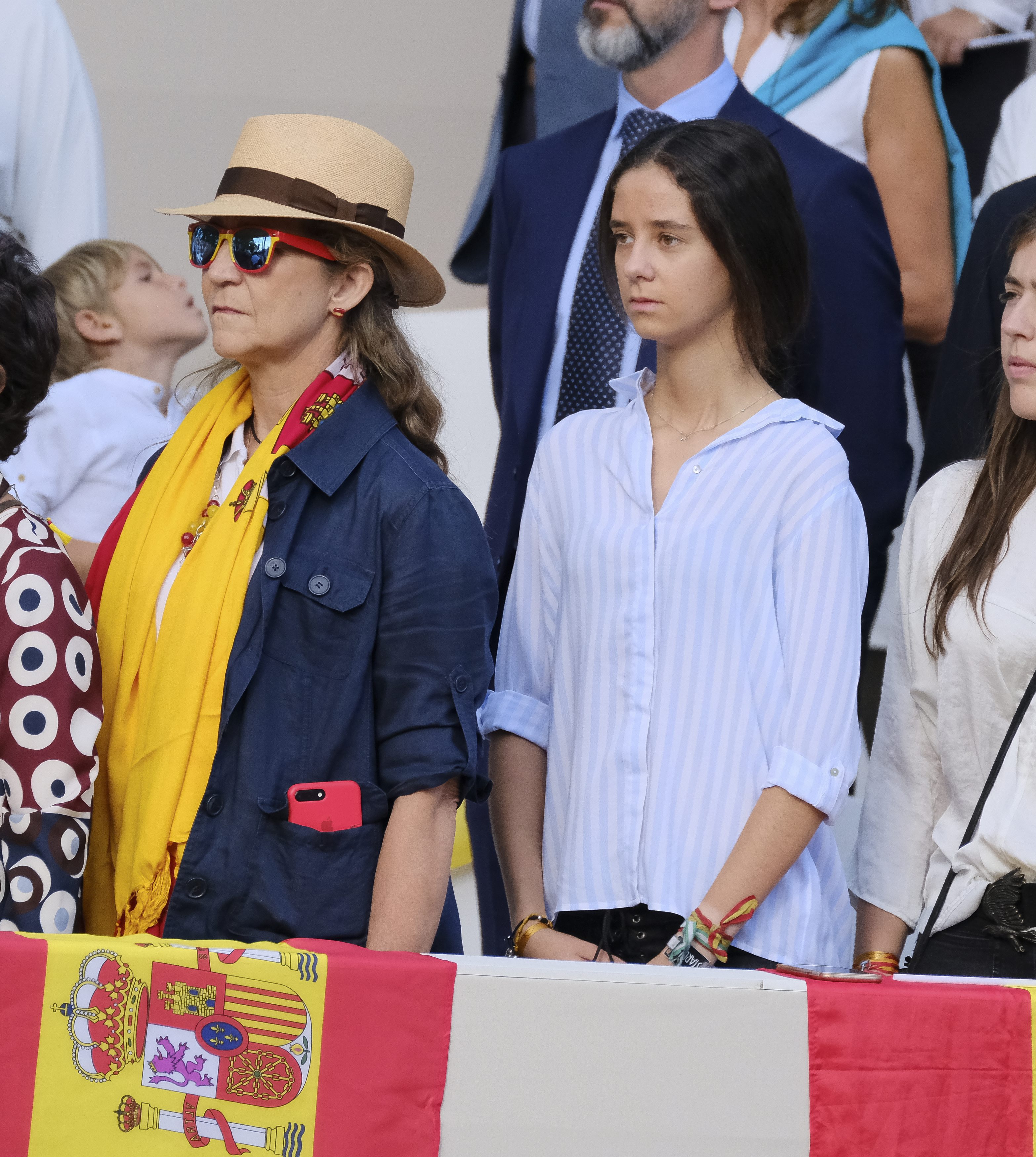 Junto a la infanta Elena en un desfile del 12 de octubre, una cita anual que nunca se pierden. En su muñeca izquierda luce orgullosa una pulsera con la bandera de España.