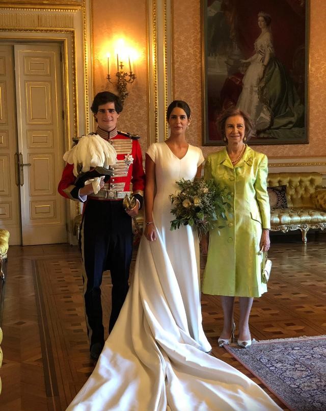 La Reina Sofía ha asistido en el Palacio de Liria, de Madrid, a la boda de Fernando Fitz-James Stuart y Solís, duque de Huéscar e hijo del duque de Alba, y Sofía Palazuelo.