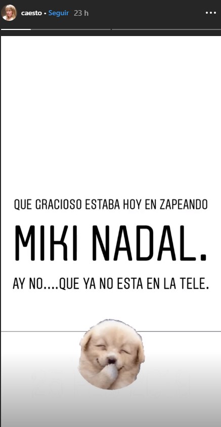 Parece que Carmen quiere continuar con la guerra –a pesar de que el matrimonio de su hija se ha roto– y publicó un mensaje contra el humorista en su Instagram. "Qué gracioso estaba hoy en Zapeando Miki Nadal. Ay no, que ya no está en la tele", escribió la exsuegra junto a la imagen de un perro riéndose. Lo cierto es que el colaborador lleva varios días sin aparecer en el programa de sobremesa de La Sexta, y todo apunta a que se debe a la condena por un delito leve de vejaciones a la que se enfrenta.