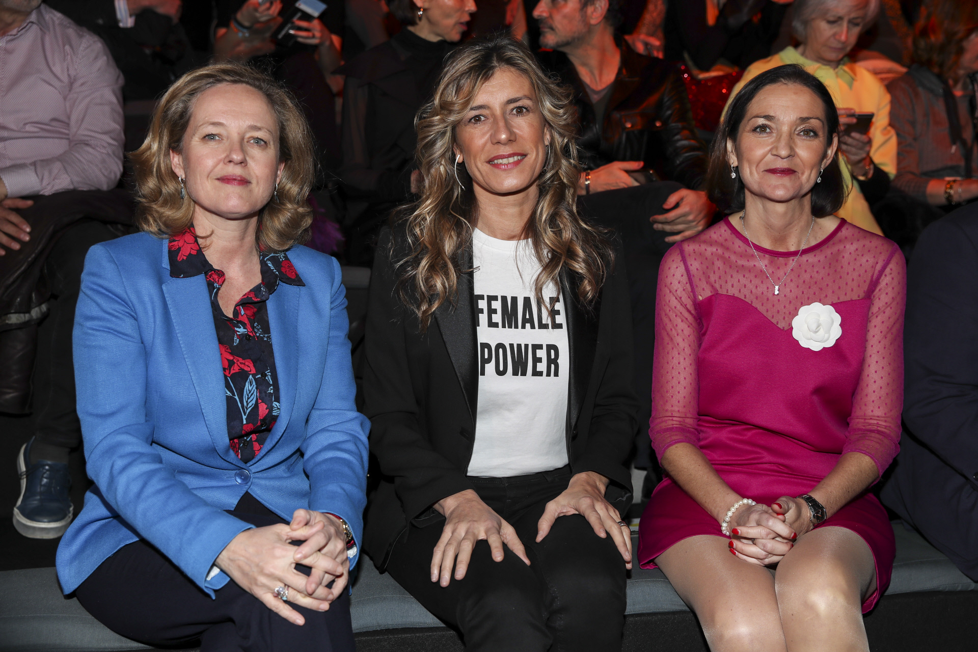 No todo han sido mítines políticos ni viajes oficiales para Begoña. Algunos de sus actos favoritos han sido desfiles de moda para apoyar a nuestros diseñadores patrios. La mujer de Pedro Sánchez estuvo en la primera fila de los desfiles de Roberto Verino –en compañía de las ministras Nadia Calviño y Reyes Maroto– y Teresa Helbig. A pesar de la importancia que tiene el estilismo para las invitadas que se citan en Ifema, Gómez optó por un look muy discreto y sencillo, pero con mensaje. Para el desfile de Verino optó por una americana, vaqueros ceñidos negros, y zapatos de tacón stilettos en el mismo color. Lo único llamativo fue la camiseta, un diseño blanco en el que se podía leer "Female power", es decir, "poder femenino". La prenda en cuestión está muy alejada del glamour que rodea a la antigua pasarela Cibeles, ya que se trata de una camiseta de Bershka que en rebajas se puede encontrar por tan solo 3,99 euros.