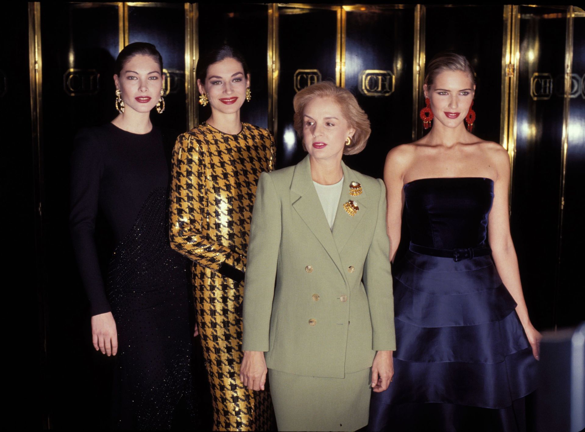 Una foto de las supermodelos Cristina Piaget y Judit Mascó junto a la diseñadora Carolina Herrera en 1990.