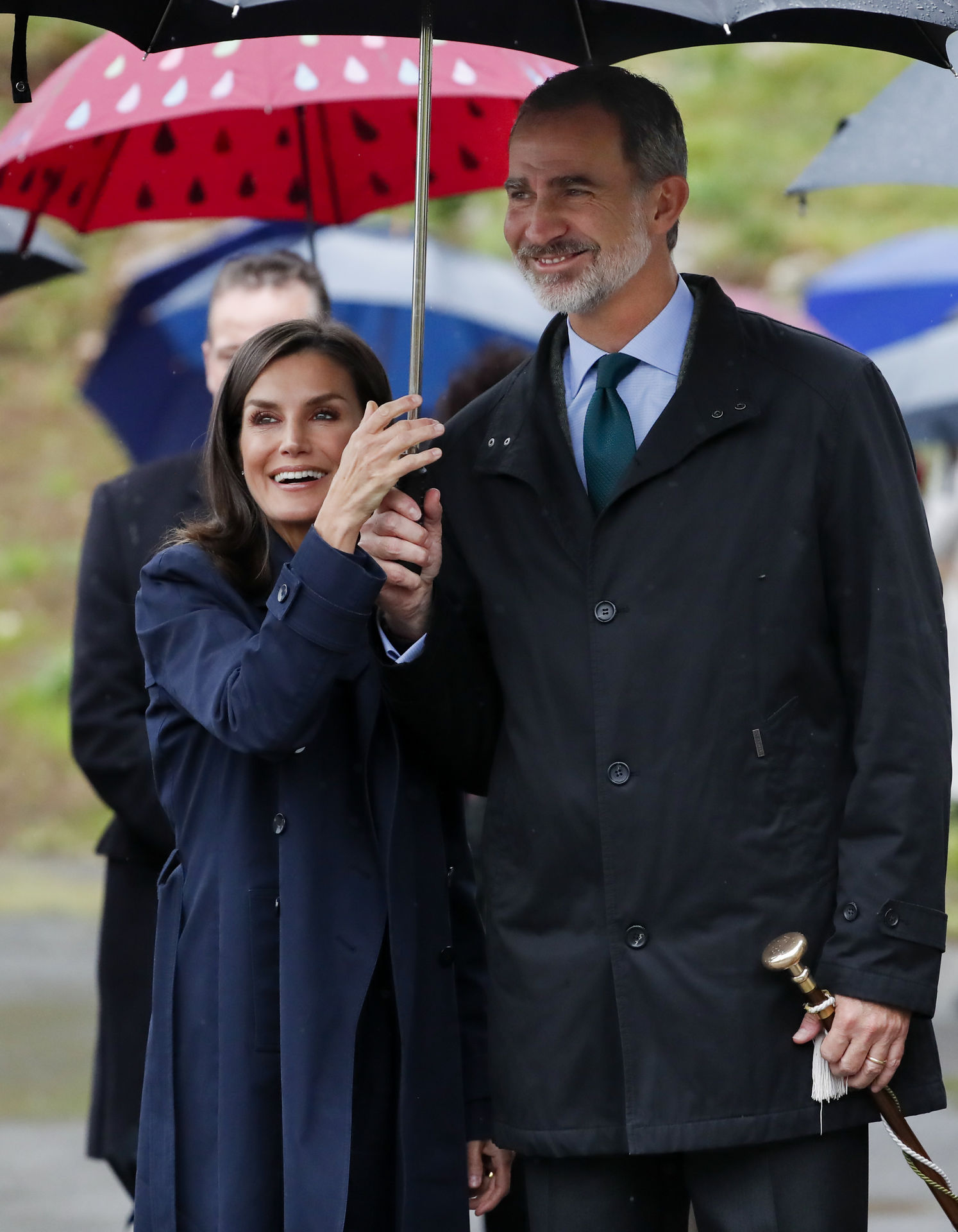 A su llegada, con cerca de media hora de retraso, se han guarecido de la lluvia con sendos paraguas en el momento de descender del vehículo, entre los sones de bienvenida de la gaita y el tamboril.