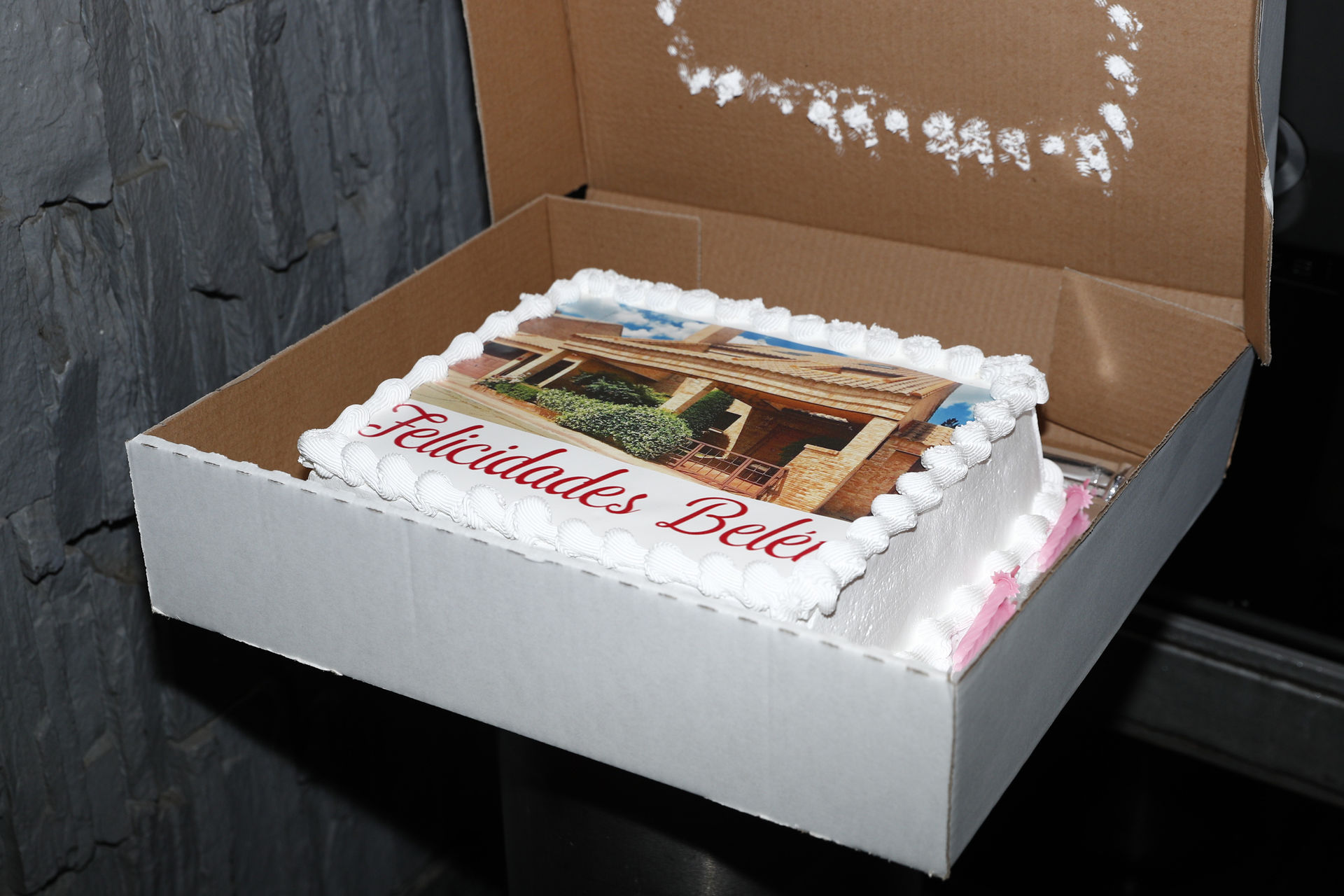 La tarta del 46 cumpleaños de Belén Esteban con una imagen de la casa que fue de Toño Sanchís y que ahora le pertenece.