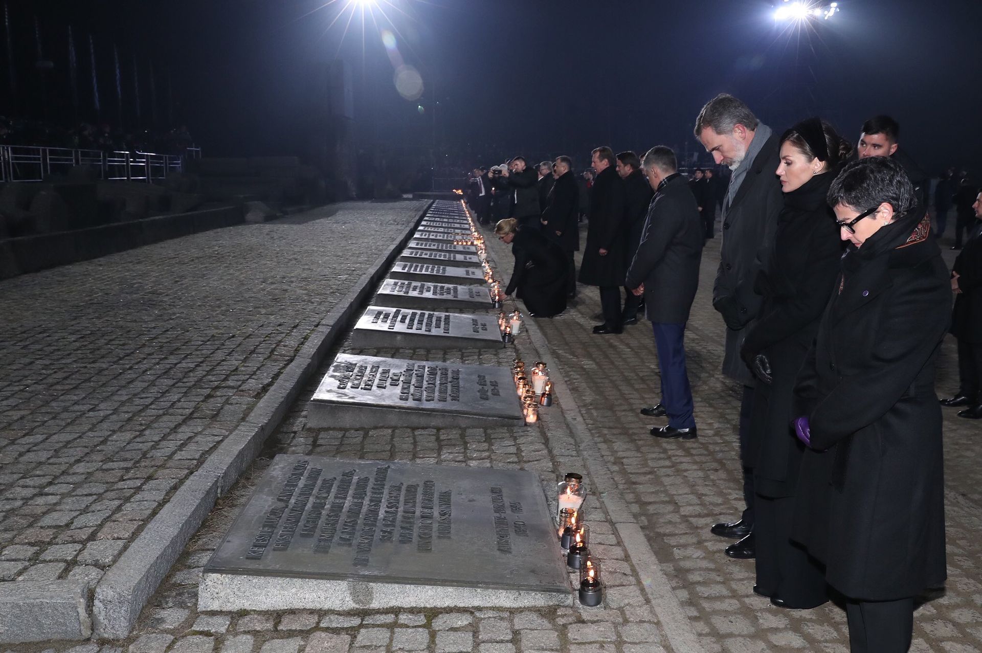 Los Reyes rindieron este lunes homenaje en el campo de concentración y exterminio nazi a las víctimas del Holocausto con una ofrenda floral en el denominado Muro de la Muerte, ante el que fueron fusiladas miles de personas.