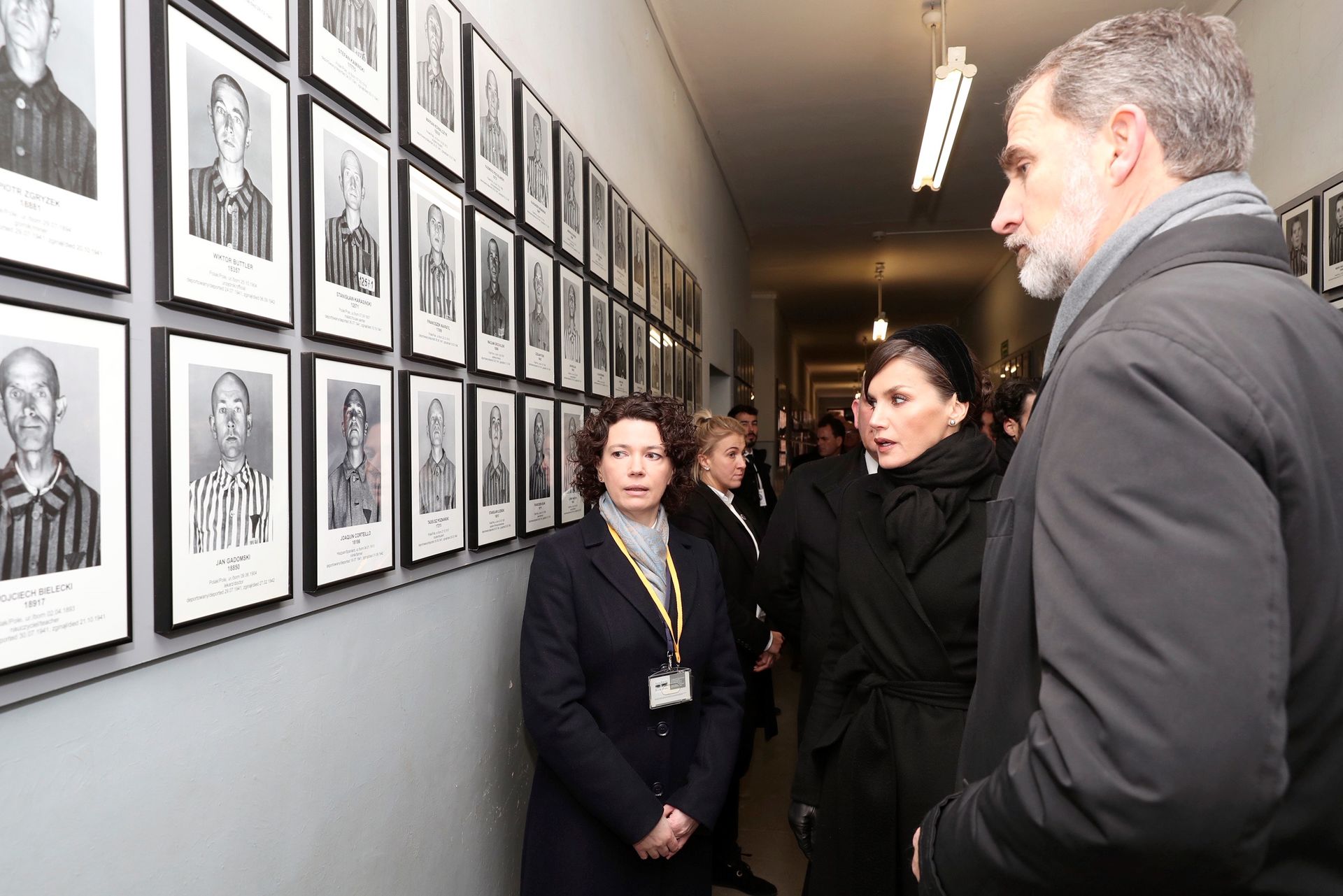 Don Felipe y doña Letizia, vestidos totalmente de oscuro, saludaron a representantes de la Asociación Amical de Mauthausen, organización que agrupa a los exdeportados republicanos de todos los campos de concentración nazis, así como de la Red del Memorial. A continuación recorrieron algunos barracones del campo, entre ellos el número 7 y en el que se encuentra la foto de uno de los españoles que fueron asesinados en Auschwitz, el agricultor valenciano Joaquín Corteillo.