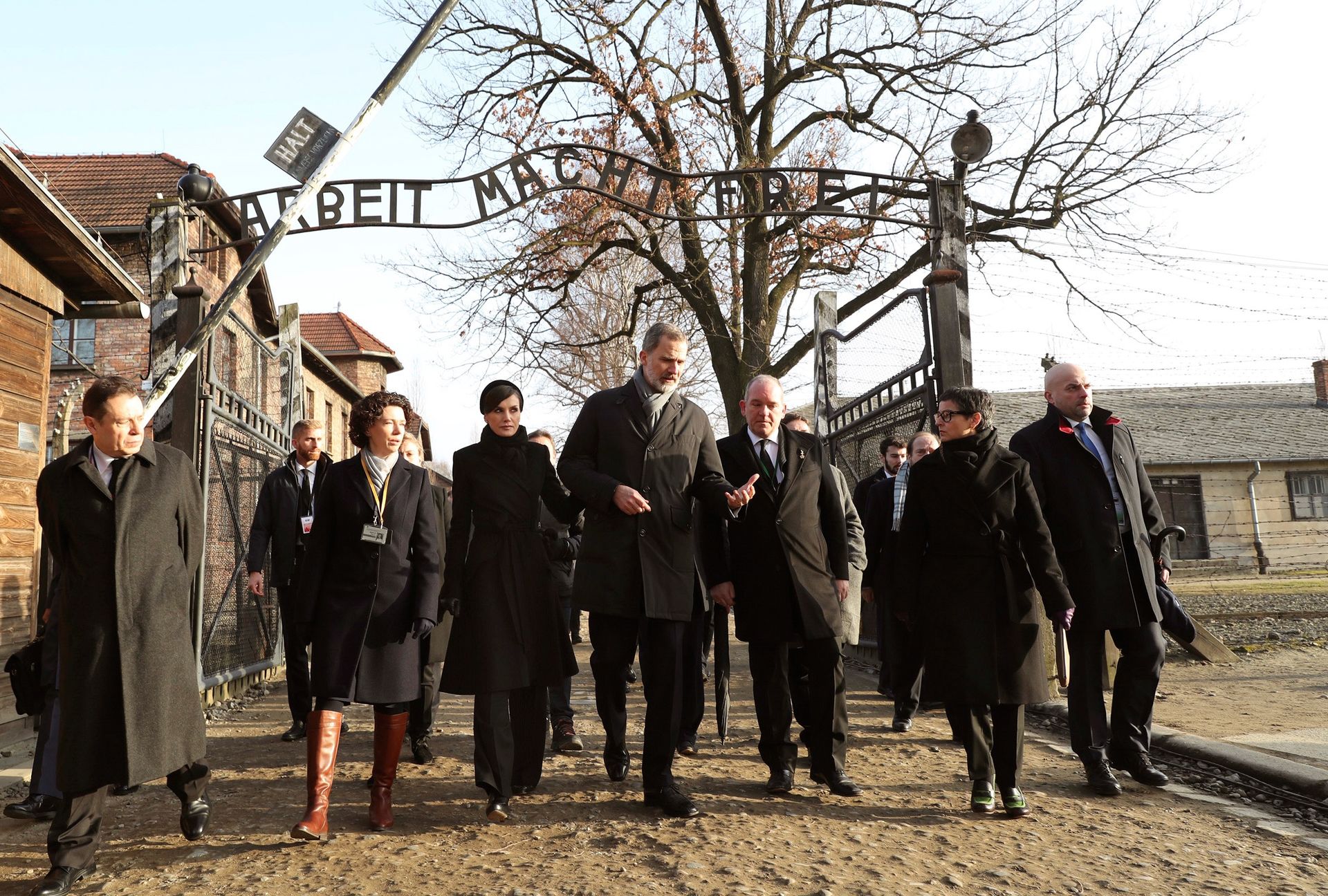 Fue antes del acto central conjunto con todos ellos cuando los Reyes de España quisieron rendir un homenaje particular a las víctimas. Al llegar al campo, atravesaron a pie la puerta de Auschwitz I, en la que se encuentra la inscripción en alemán "El trabajo os hace libres".