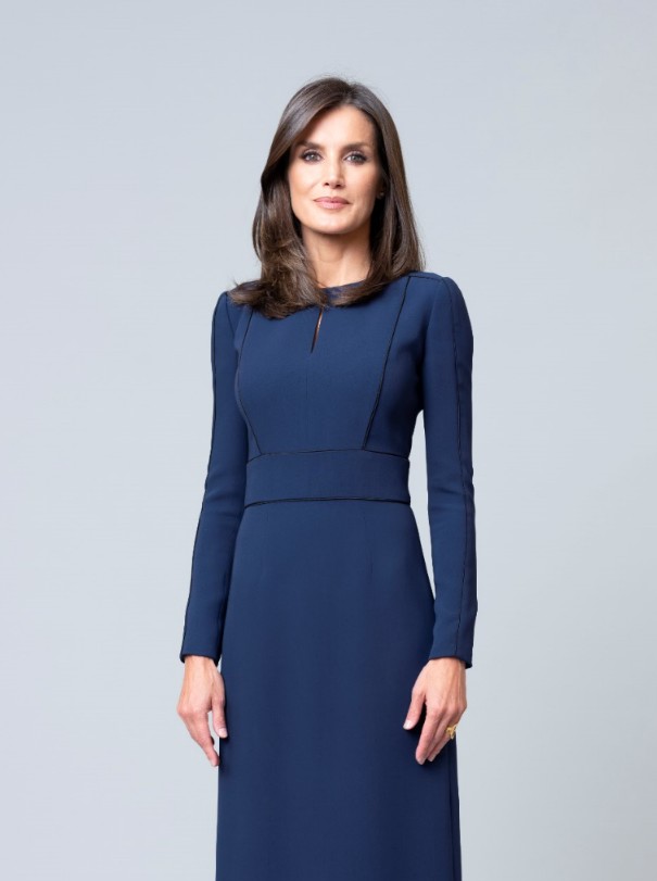 Para el retrato civil Doña Letizia ha optado por un look mucho más discreto. Confiando también en Carolina Herrera, la mujer de Felipe VI luce un vestido sobrio con escote cerrado con una discreta abertura en forma de lágrima, de manga larga, ajustado a la cintura y por debajo de la rodilla.