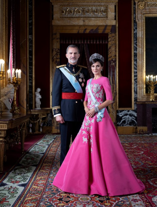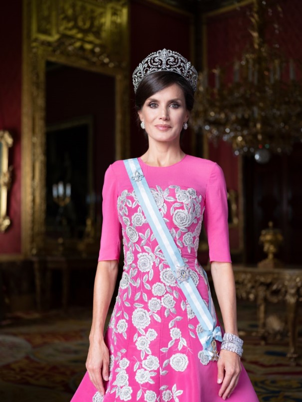 La Reina Letizia ha posado con un vestido largo en color rosa y flores bordadas en tono gris. Un diseño firmado por Carolina Herrera que Doña Letizia estreno durante una cena de gala en Japón con motivo de la entronización de Naruhito. Igual que en esa ocasión, ha completado su look abriendo el joyero de los Borbones y rescatando la impresionante Tiara Flor de Lis. Una de las más importantes y emblemáticas de su colección y que tiene un gran valor histórico ya que Alfonso XIII la mandó a fabricar como regalo de bodas para su mujer, la Reina Victoria Eugenia. Además posa con unos pendientes de brillantes y esmeraldas de la reina emérita Sofía y las pulseras gemelas de Cartier.
