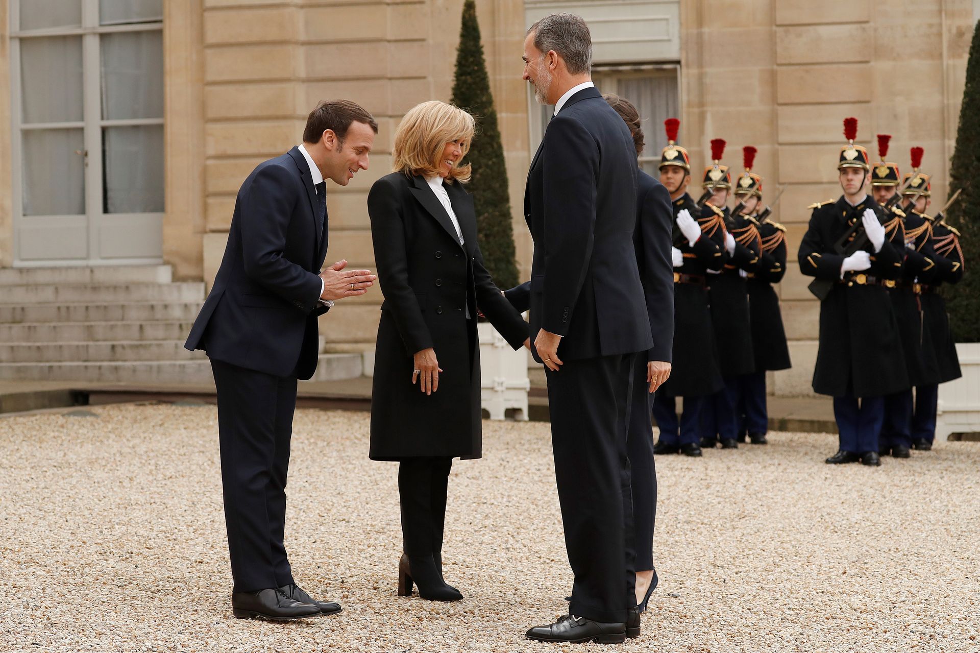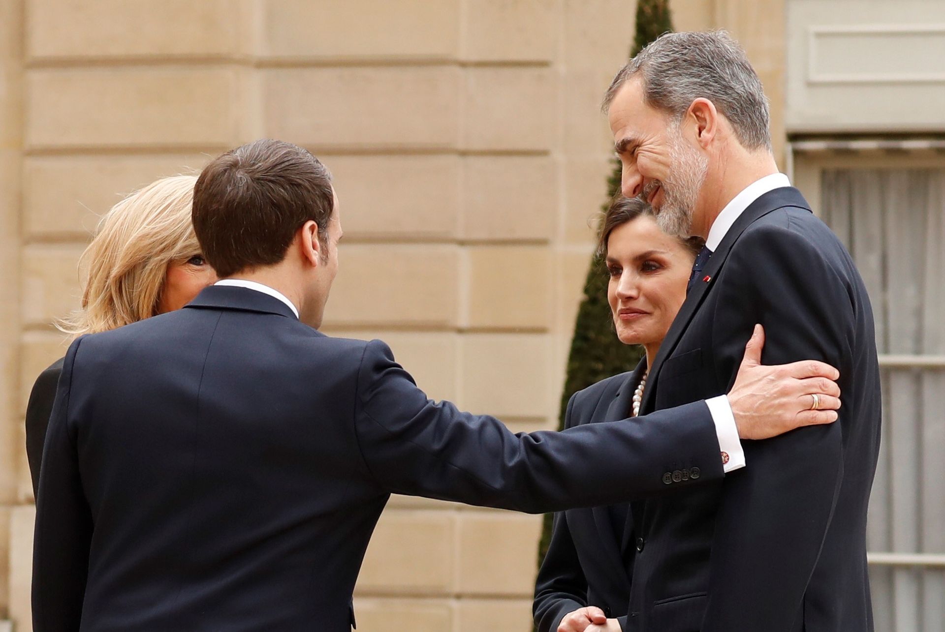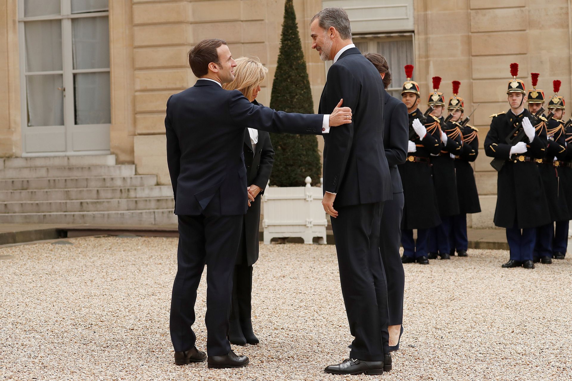 A la llegada de los Reyes al Elíseo no hubo ni besos ni estrechamientos de manos por prevención, tan solo cariñosos gestos en los brazos entre anfitriones e invitados.
