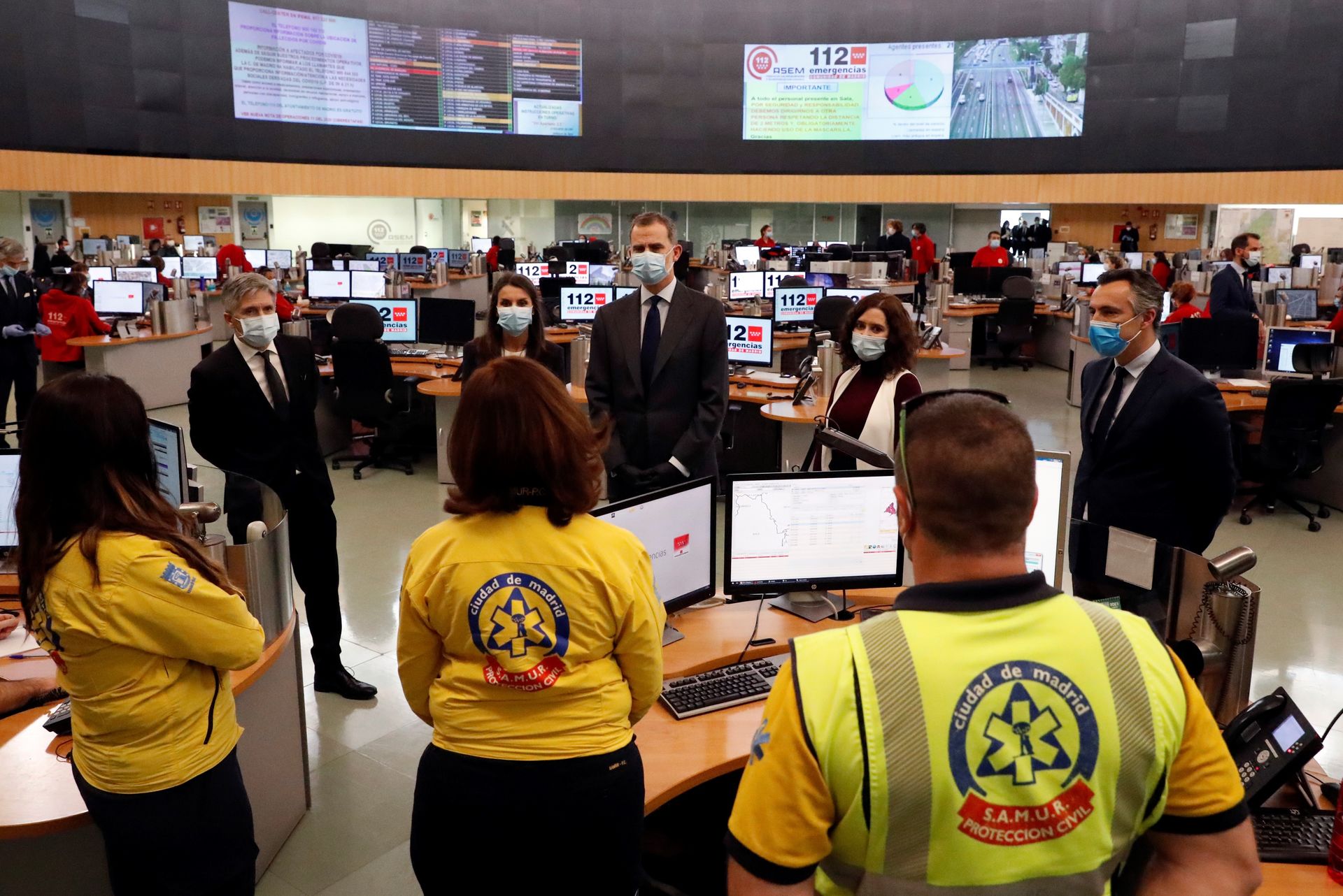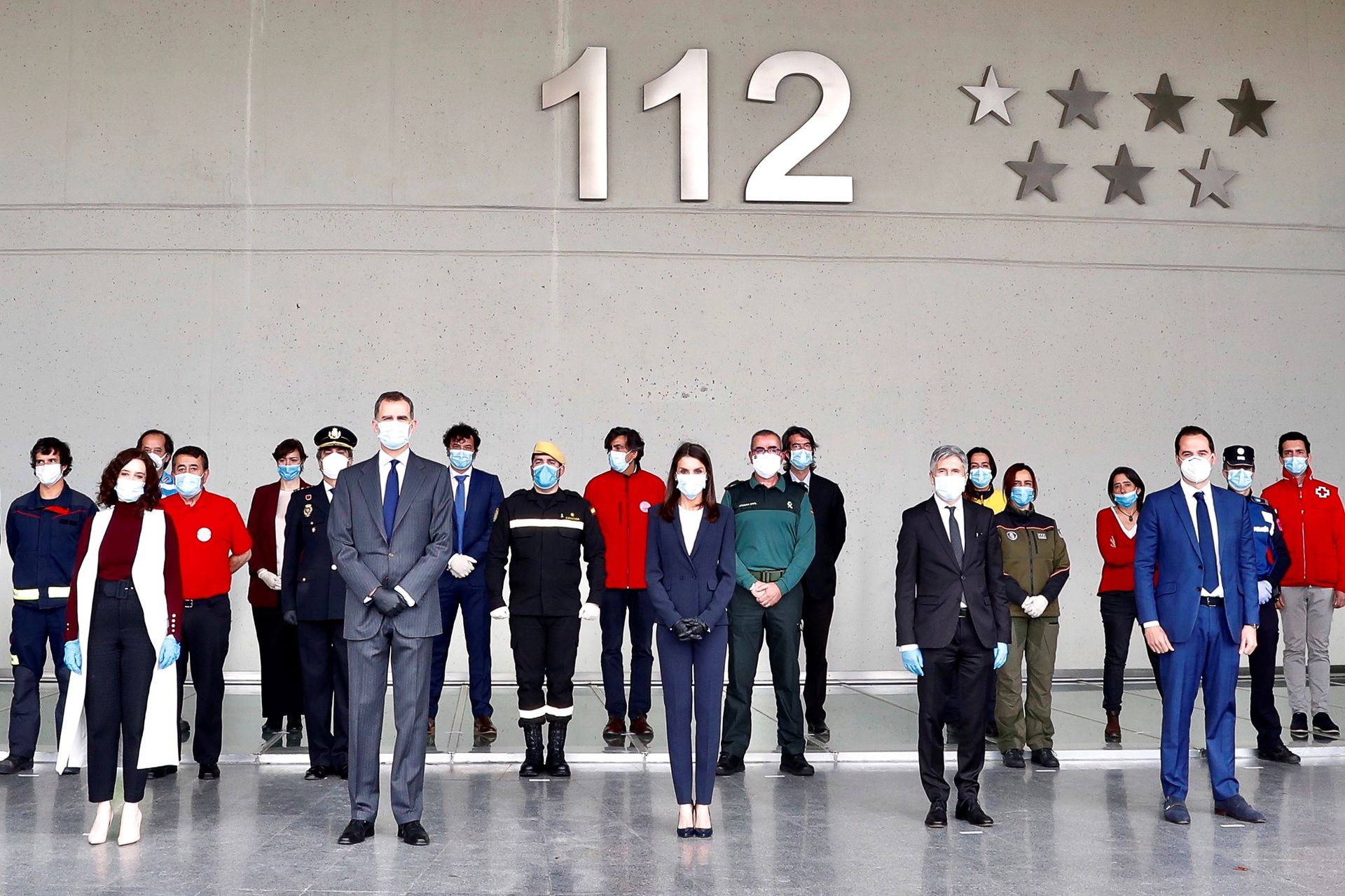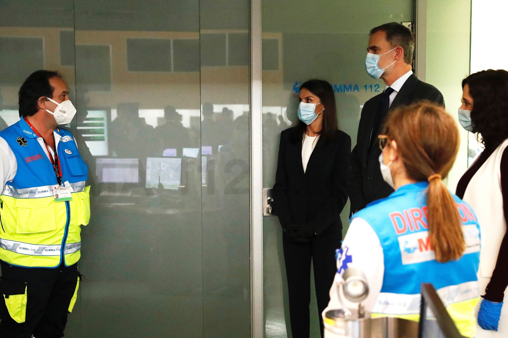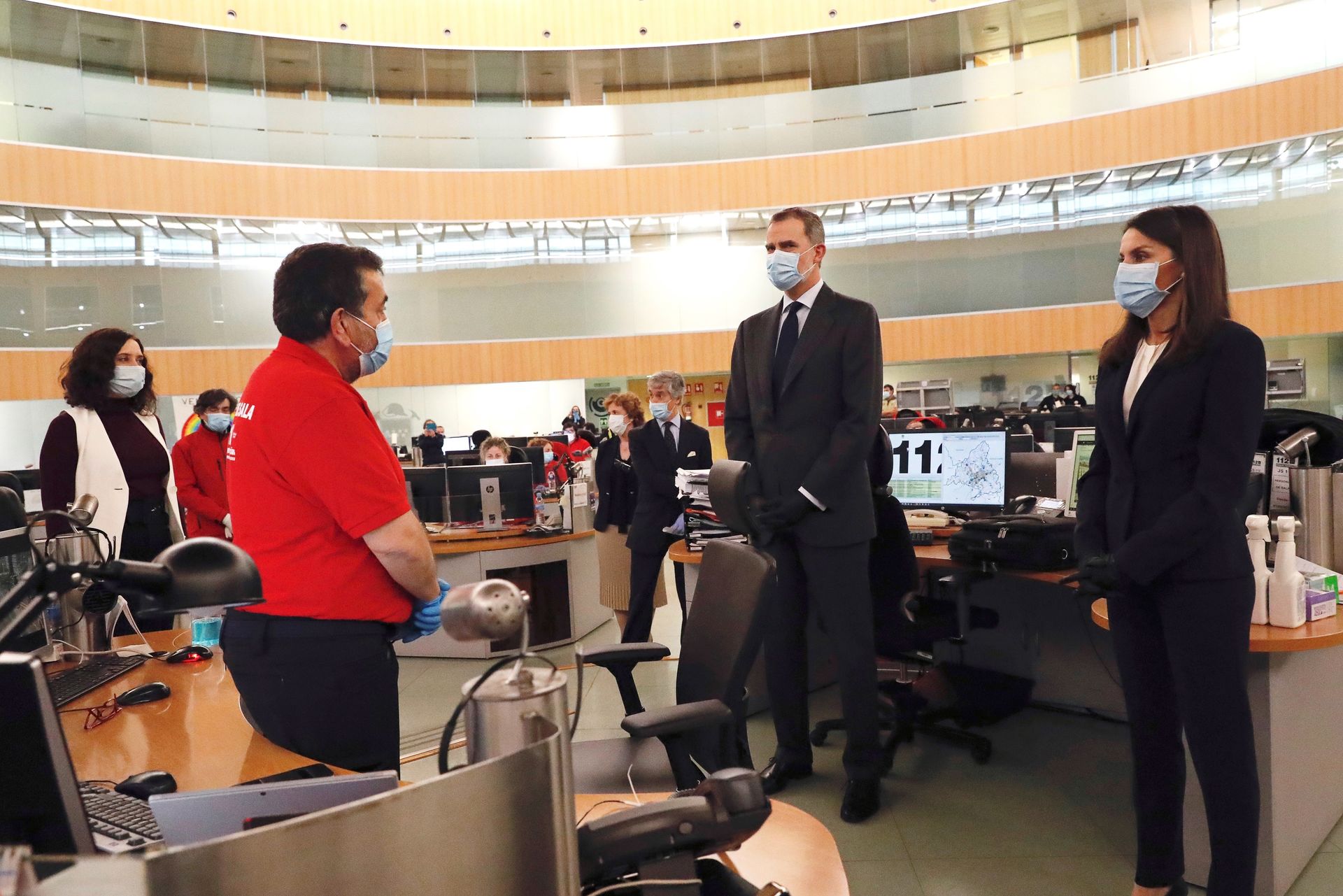 Don Felipe y doña Letizia visitaron este lunes la sede de Emergencias 112 de la Comunidad de Madrid junto con la presidenta regional, Isabel Díaz Ayuso, y el vicepresidente, Ignacio Aguado.