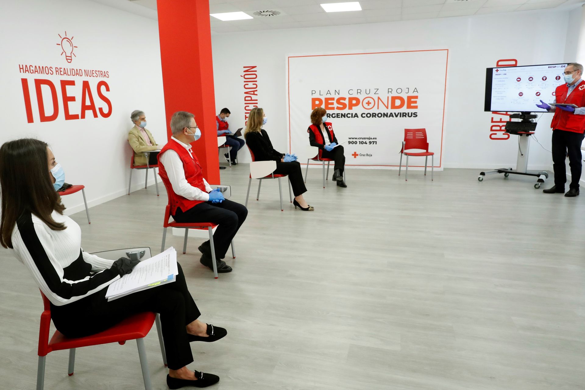 La visita comenzó con una reunión en la que le explicatron las principales medidas del programa Cruz Roja Responde, puesto en marcha desde hace casi dos meses ante la emergencia del Covid-19, que ha movilizado a más de 40.000 voluntarios y que ha llegado a 1,5 millones de personas. El plan incluye varias áreas de actuación, como salud, educación, empleo y asistencia a mayores.