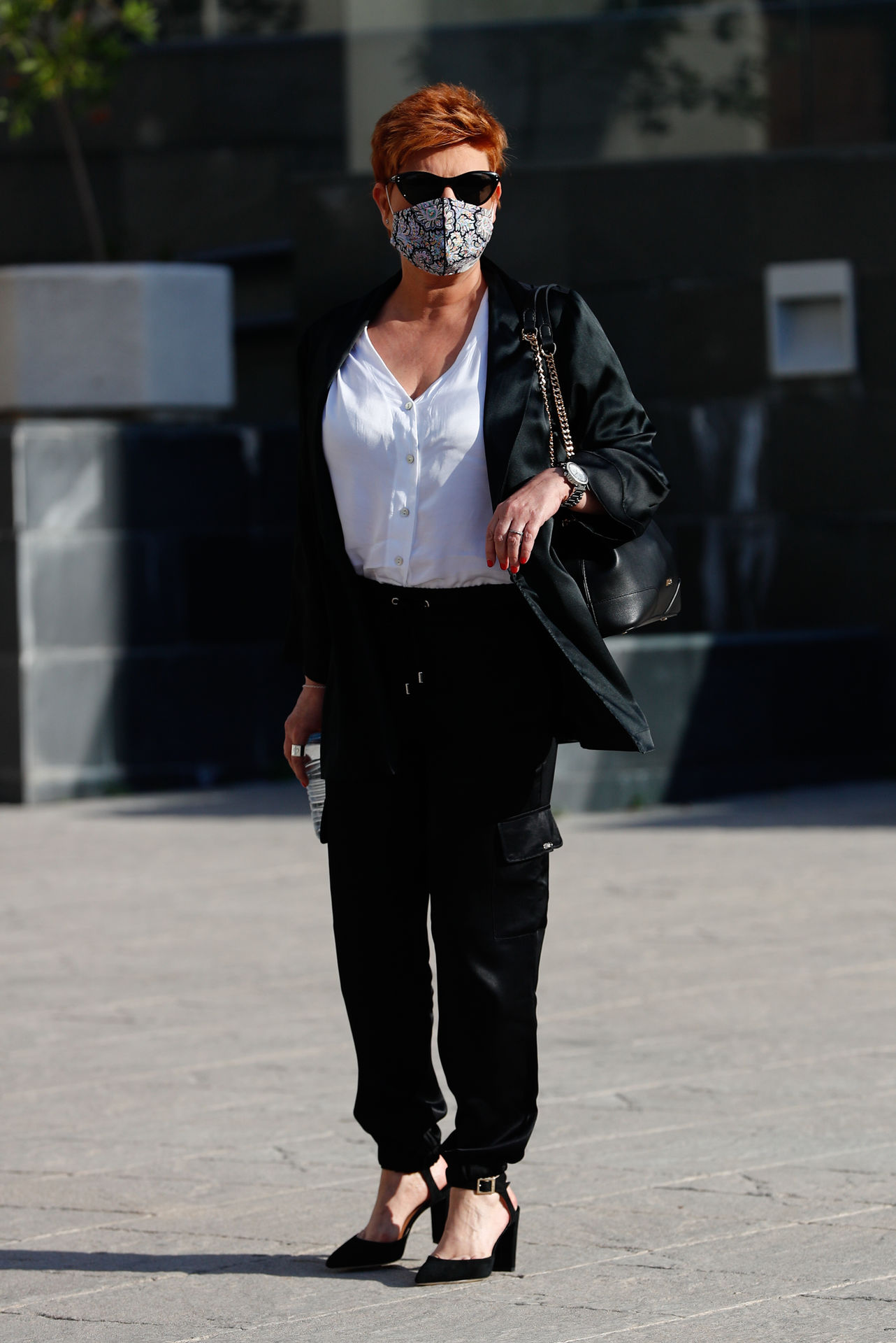De riguroso negro, Ana Obregón lució para la ocasión un vestido midi con la parte superior de tull creación de su amigo el diseñador Alejandro de Miguel. A juego con el vestido, también una mascarilla con un corazón en color rojo bordado en uno de los laterales y en el otro el nombre de su hijo.