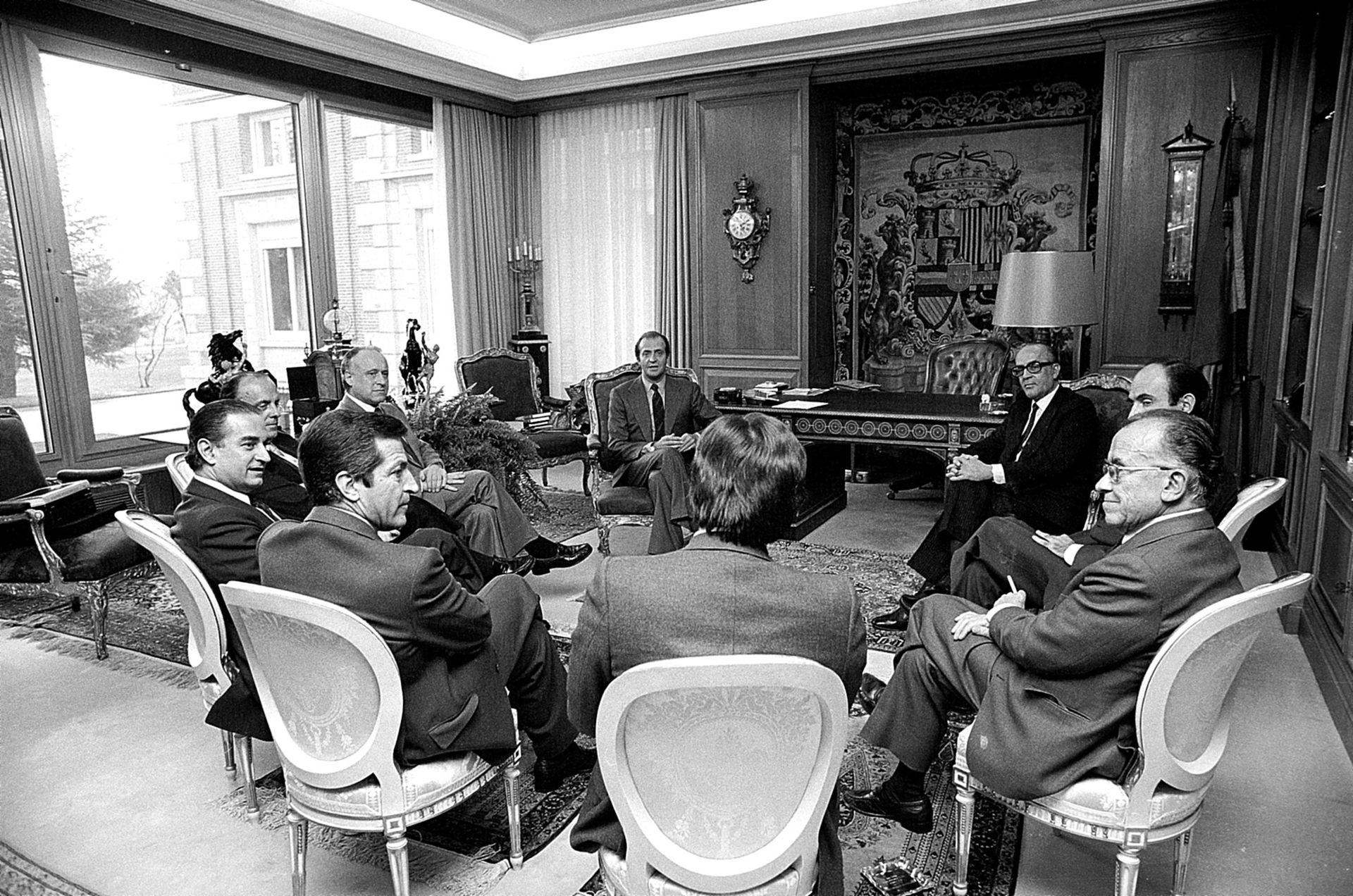 En la mañana del día 25 de febrero de 1981, todos los dirigentes políticos fueron recibidos por el Rey en su despacho de la Zarzuela. Intercambiaron comentarios sobre lo vivido por ellos durante el golpe de Estado. En la fotografía, todos atienden a Felipe González mientras habla, una premonitoria fotografía de su triunfo electoral de 1982 que le mantendría como presidente del Gobierno durante más de 13 años. Se reunieron conJuan Carlos I Javier Arzallus, Manuel Fraga, Landelino Lavilla, Adolfo Suárez, Felipe Gonzalez, Santiago Carrillo, Miquel Roca y Calvo Sotelo.