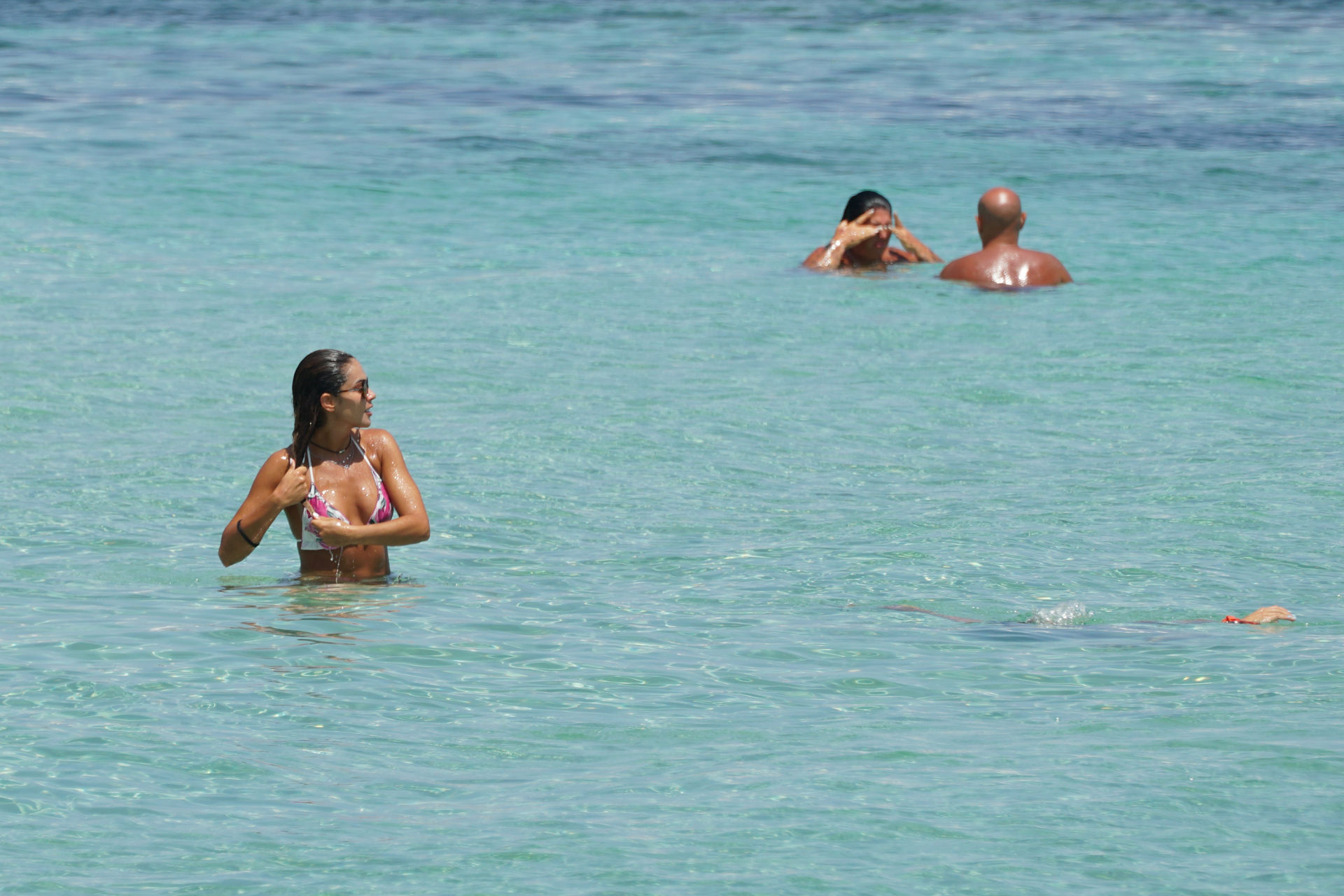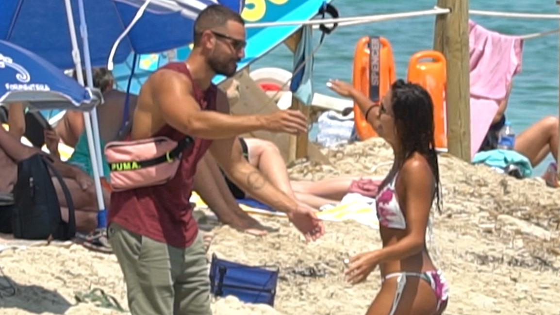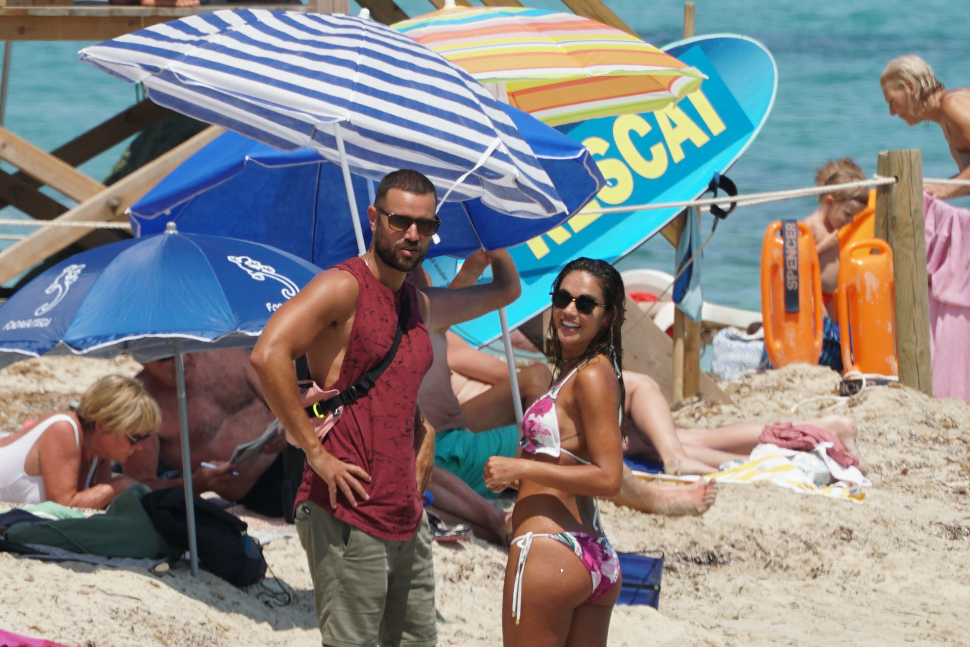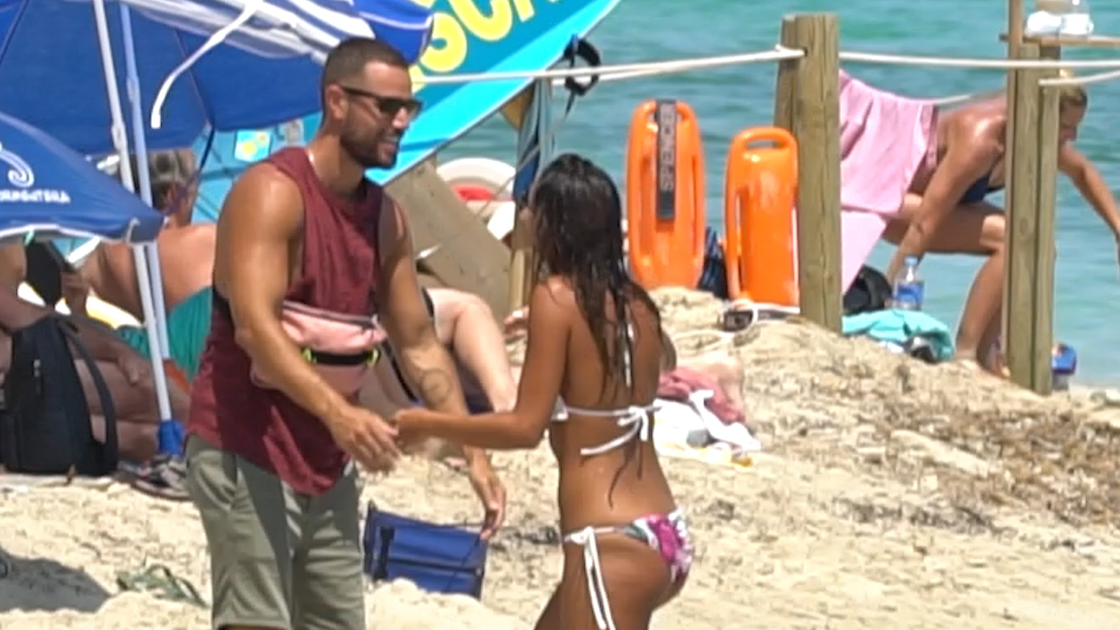 En estas imágenes tomadas en una playa de Formentera, Lara y Adrián derrochan complicidad y buen rollo. Incluso intercambiar abrazos.