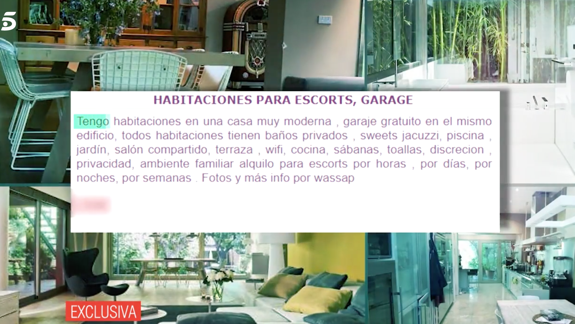 "Tengo habitaciones en una casa muy moderna, garaje gratuito en el mismo edificio, todas las habitaciones tienen baños privados, sweet jacuzzi, jardín, piscina, salón compartido, terraza, cocina...", reza el anuncio.