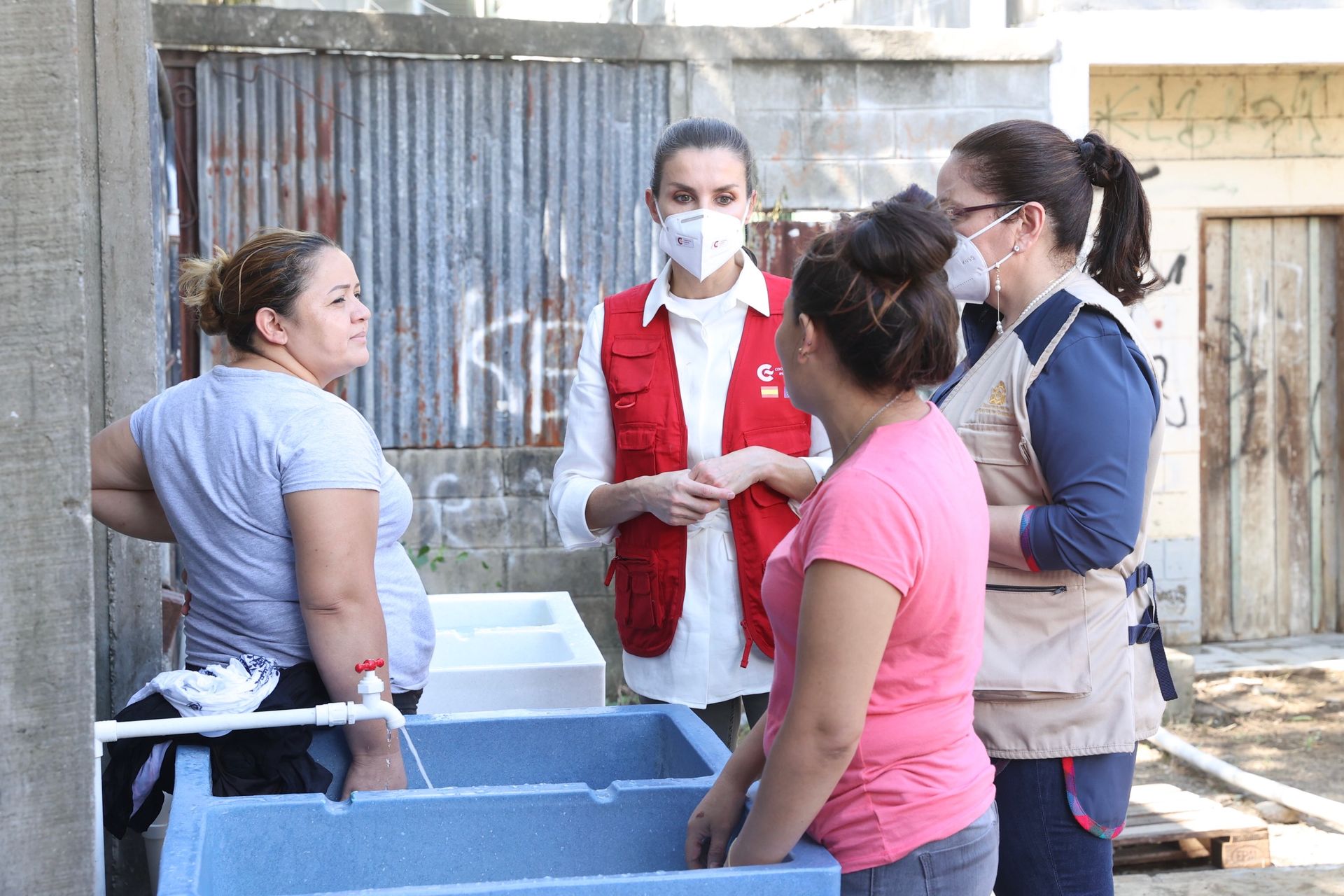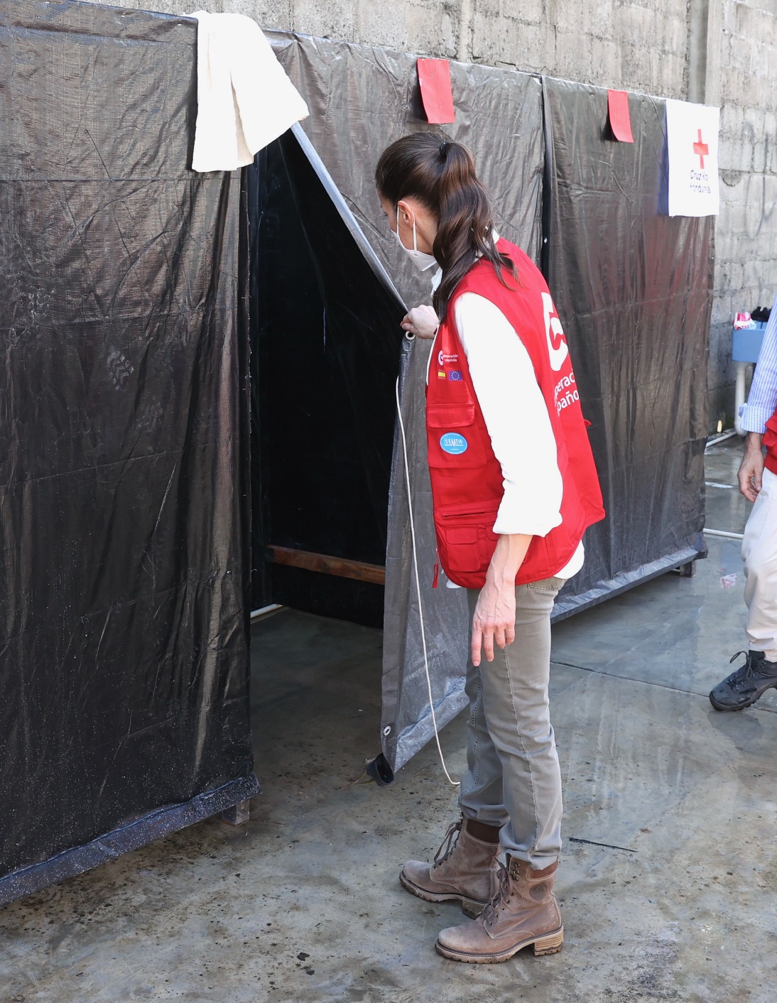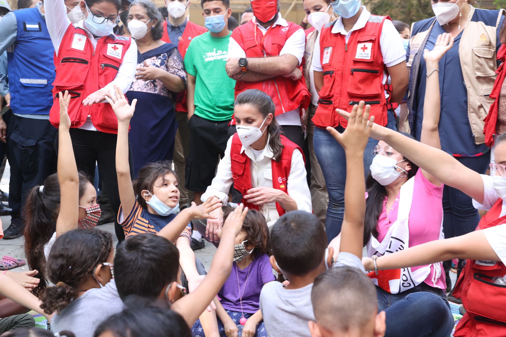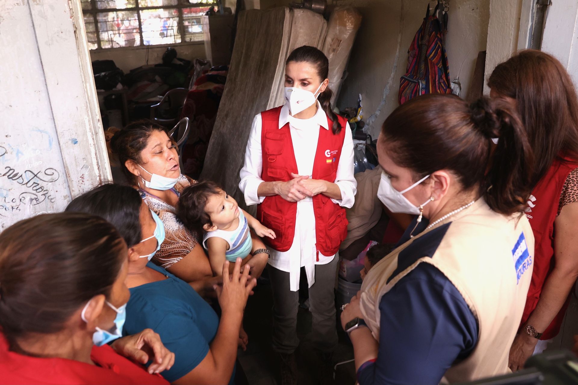 Primero Eta y, dos semanas después, Iota, arrasaron parte del país con fuertes lluvias e inundaciones que han dejado las calles y las casas cubiertas de lodo y a 100.000 personas alojadas en albergues. La reina se desplazó primero al colegio de la Colonia Flores de Oriente de La Lima, uno de los 534 que han quedado derruidos en todo Honduras.