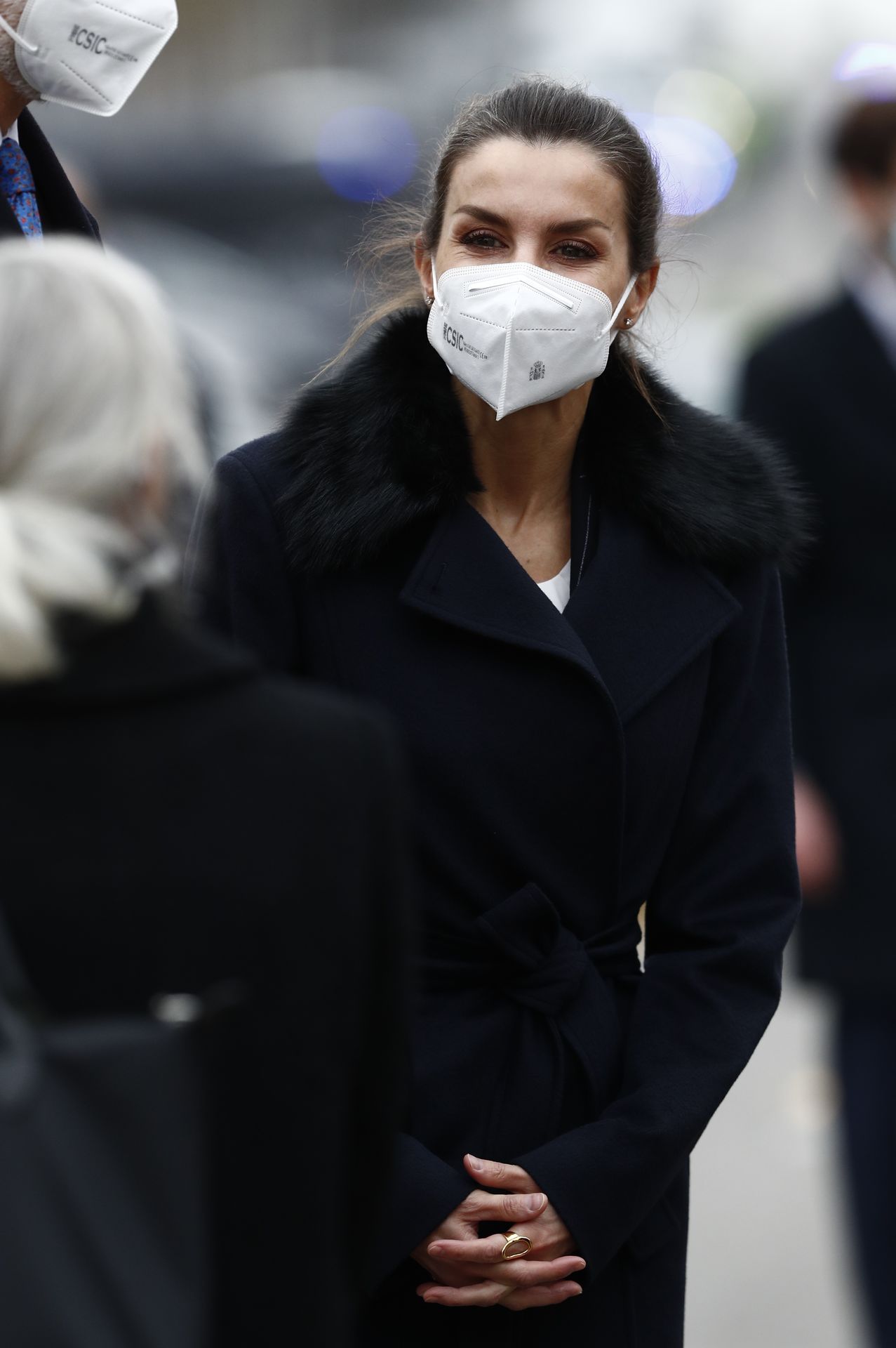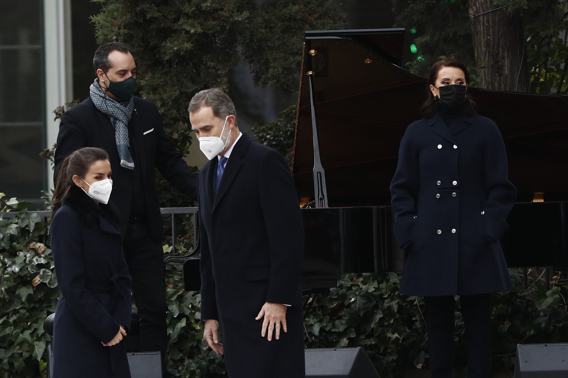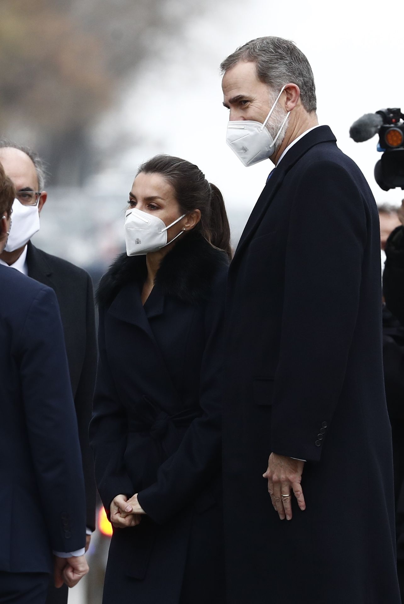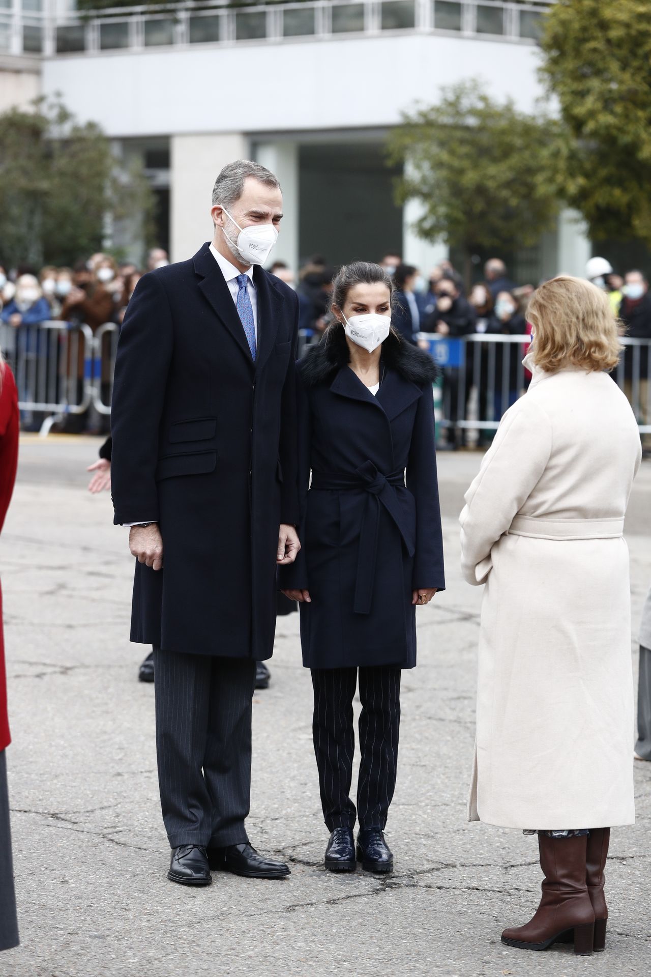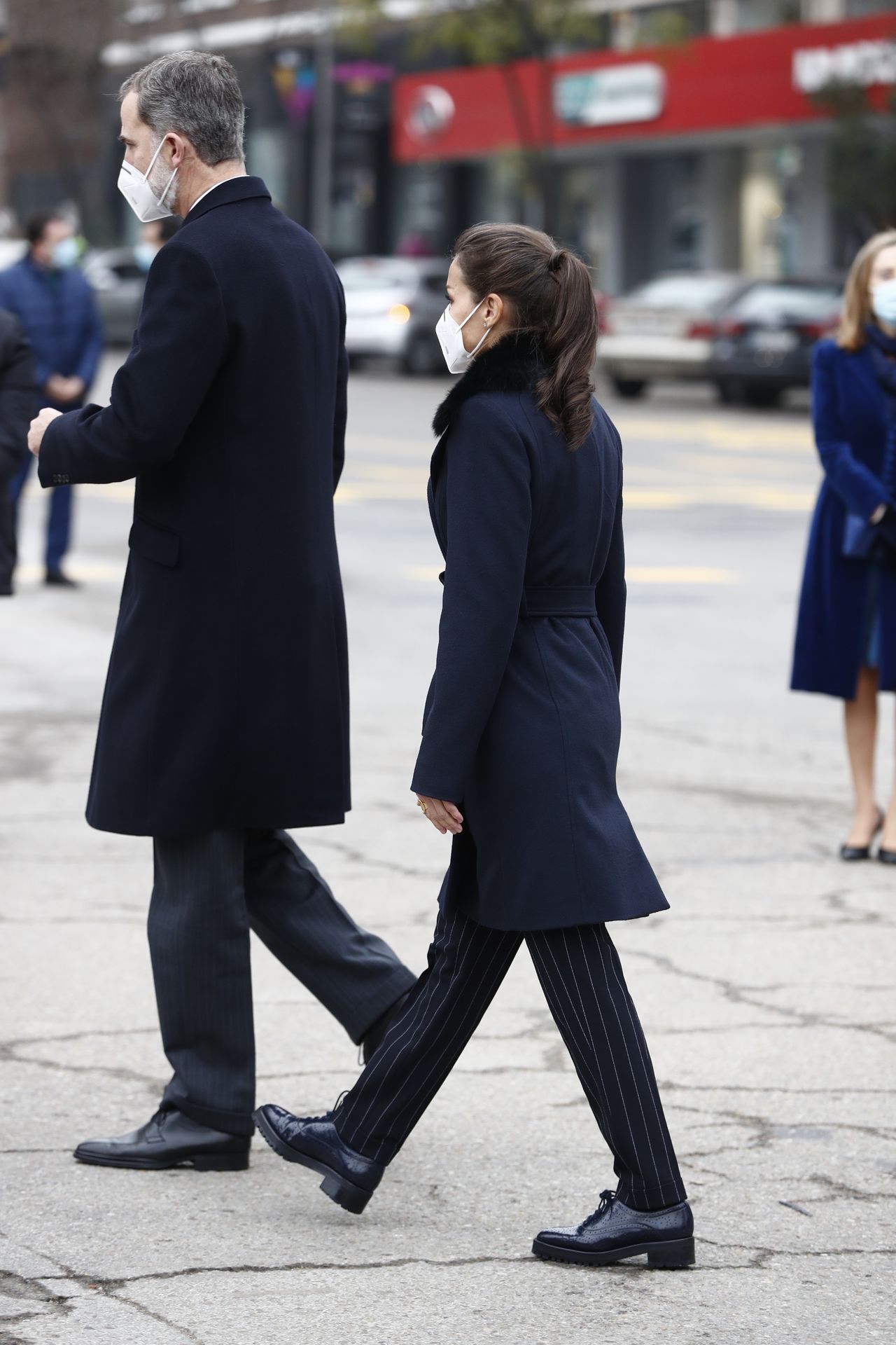 Unos zapatos masculinos estilo Oxford en color negro - que ha lucido en varias ocasiones - un pantalón de traje azul marino casi negro con raya diplomática- de la firma Mango - que se ha convertido en uno de sus preferidos y un elegante abrigo de Hugo Boss en el mismo tono, con pelo en el cuello y cierre con lazada que estrenó durante su viaje a París en marzo de este año.
