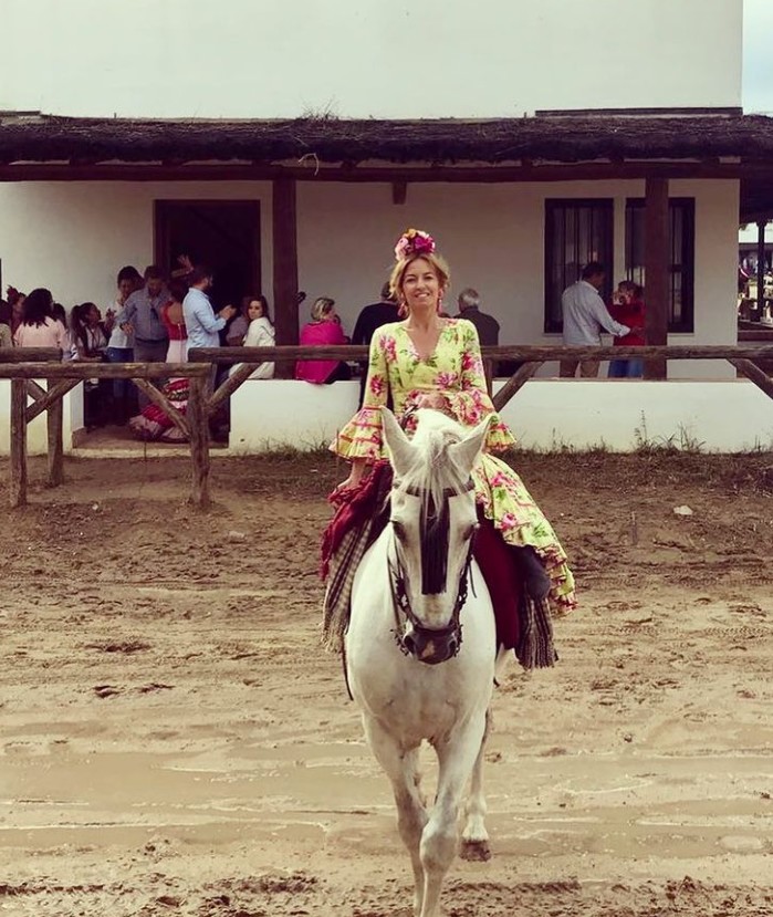 Otra de las grandes pasiones de la empresaria es caminar hasta el Rocío cada año. Con su traje flamenco, subida a caballo como toda una amazonas, año tras año disfruta del camino ocre y así lo comparte en sus redes sociales.