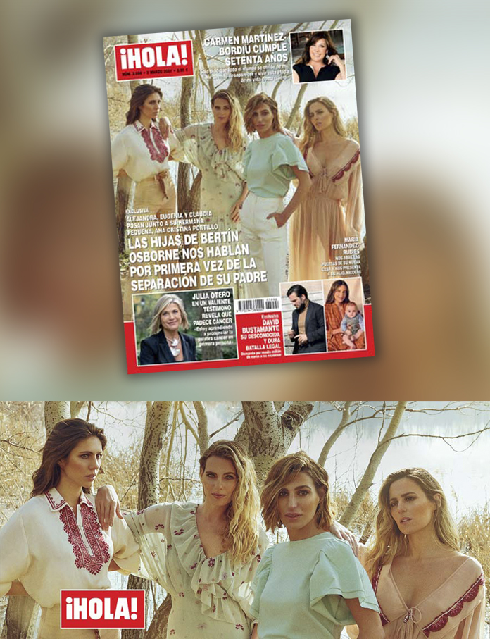 Las tres hijas mayores de Bertín Osborne —Alejandra, Eugenia y Claudia— junto a su hermana pequeña, Ana María Portillo —fruto de la relación de Sandra Domecq con Fernando Portillo— hablan por primera vez sobre la separación de su padre de Fabiola Martínez. Aprovechando que las cuatro son las nuevas embajadoras de la firma de ropa Hoss Intropia, las hijas del artista posan para la revista ¡Hola! en un extenso reportaje en el que hablan sobre sus proyectos laborales, sus vivencias personales y sus sueños de futuro.
