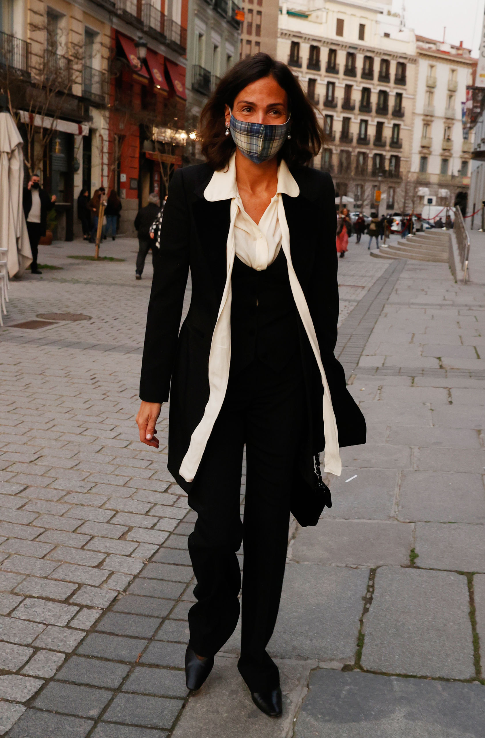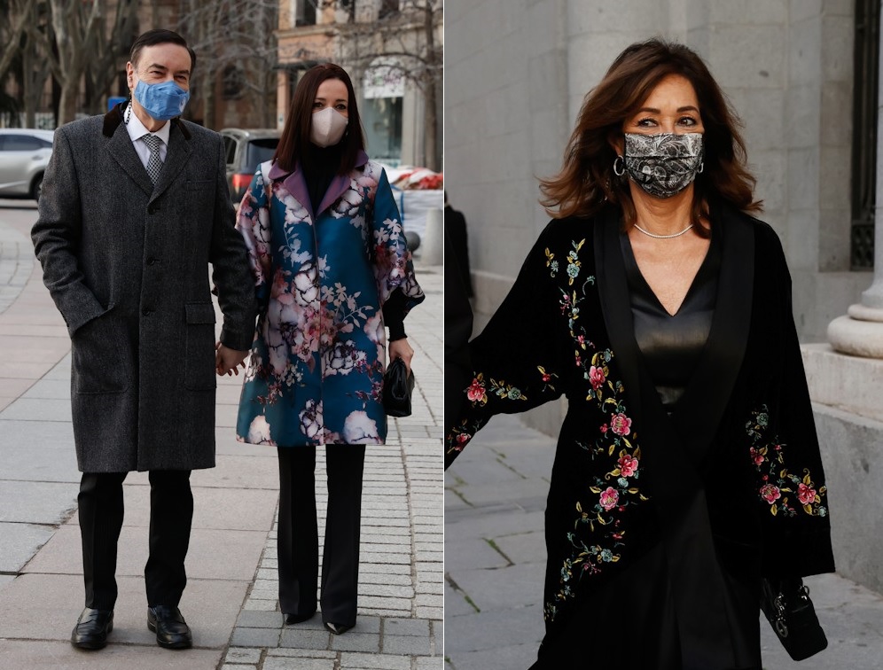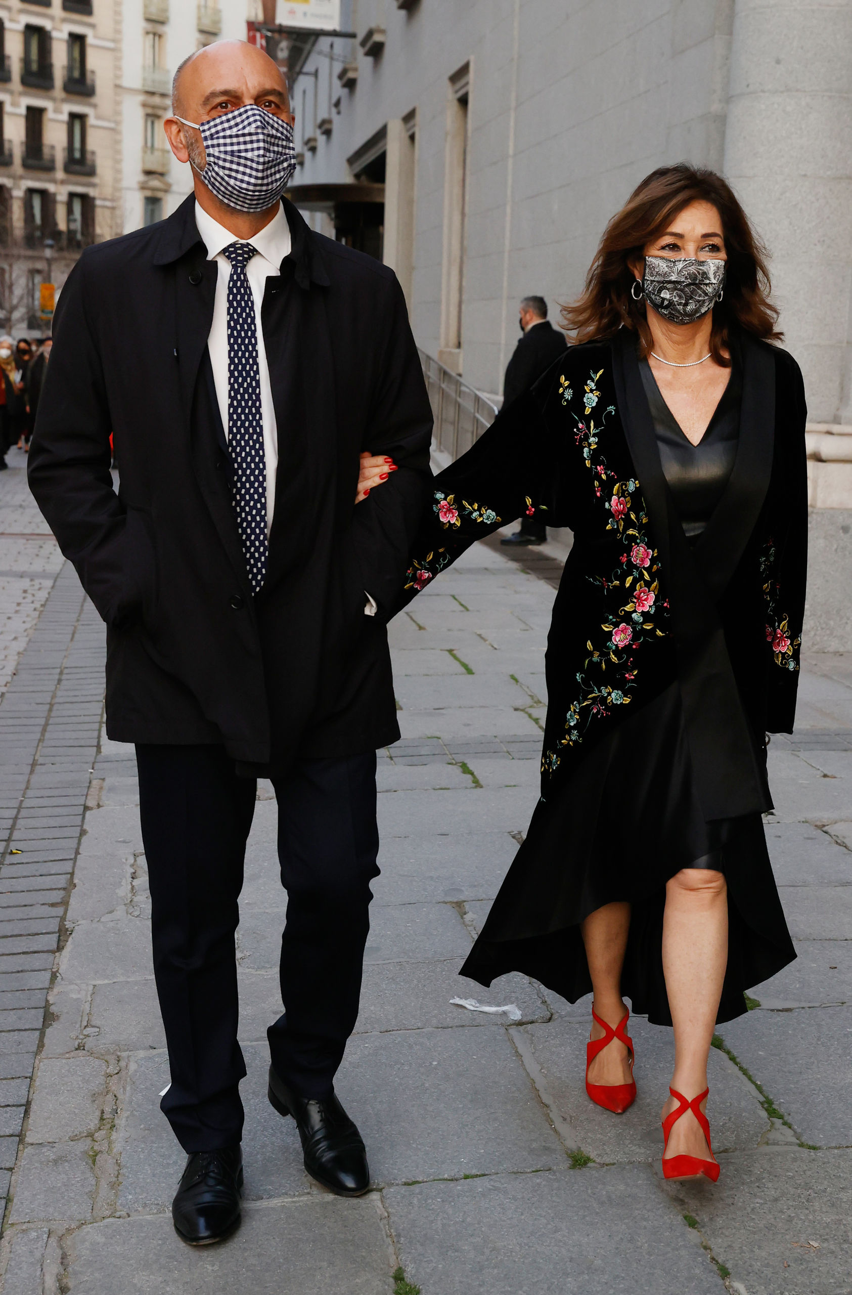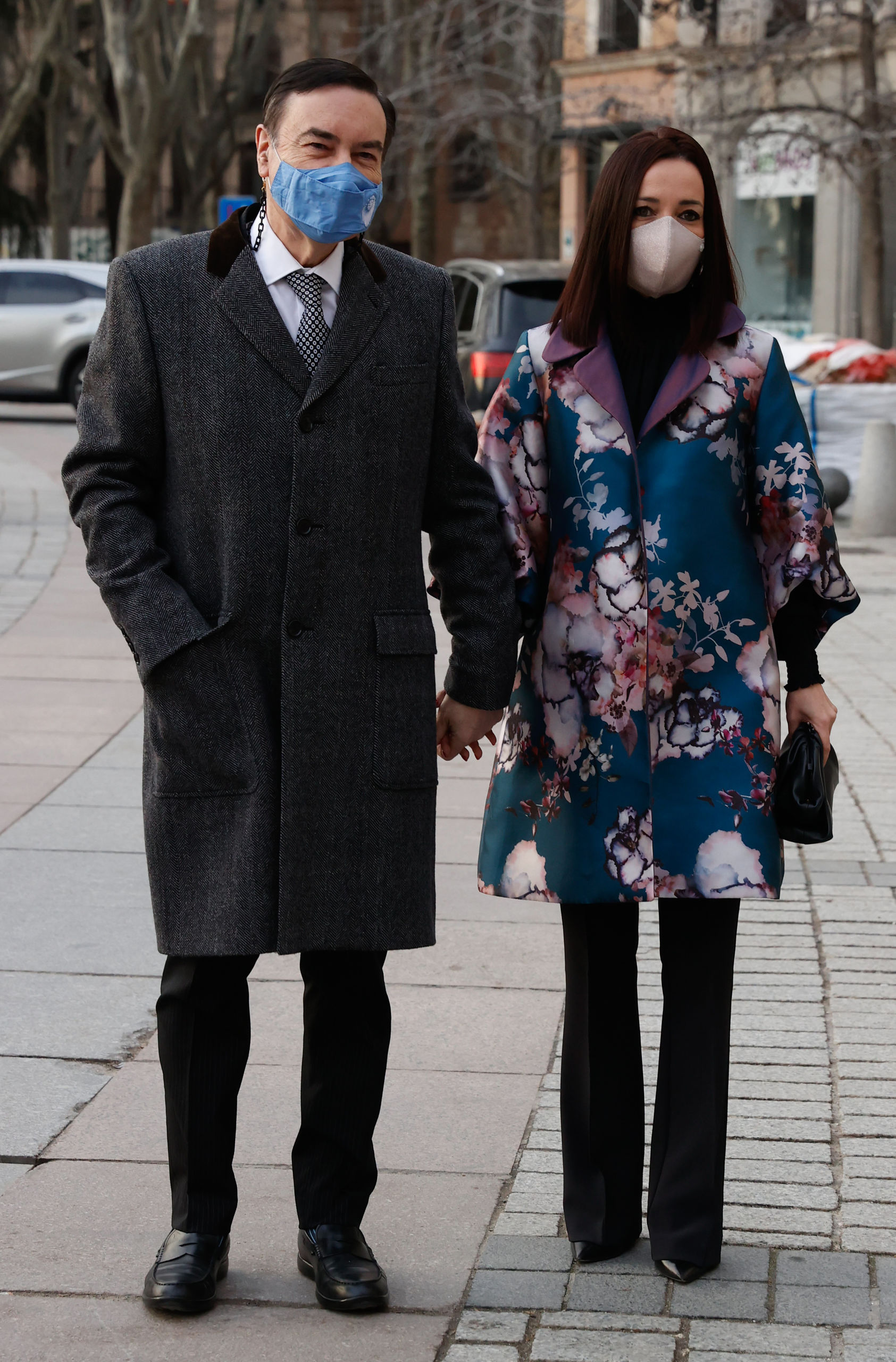 El periodista y su pareja llegaron al Teatro Real de la mano. La abogada lució un colorido abrigo con motivos orientales.