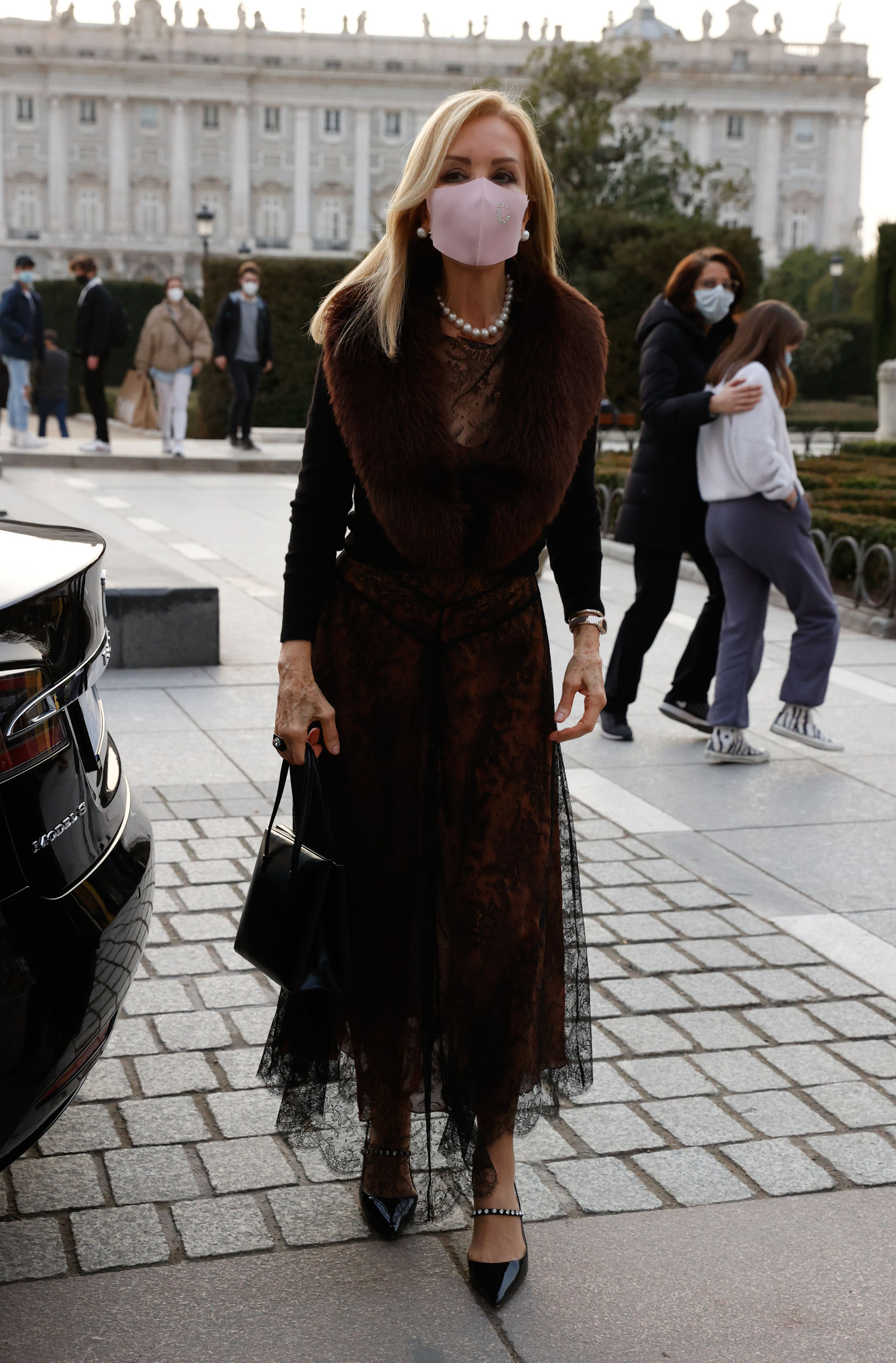 La socialité fue una de las primeras en llegar y lo hizo con una chaqueta de pelo combinada con un vestido de silueta evasé y encaje transparente.