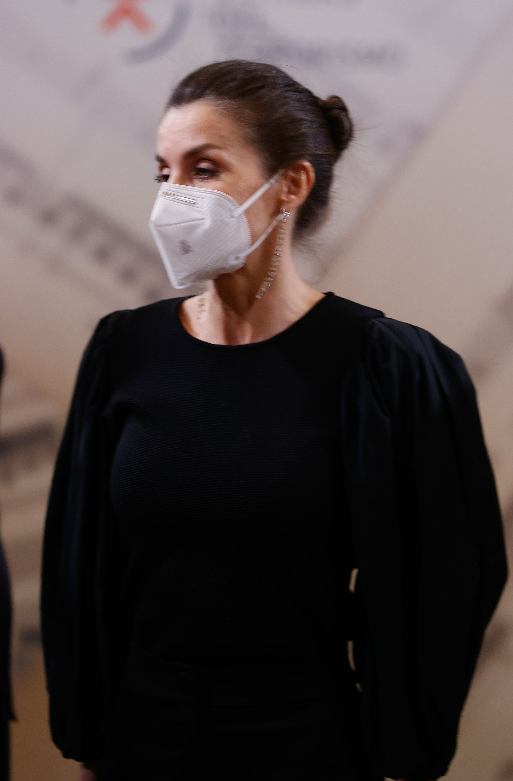 El segundo detalle que ha hecho brillar a la Reina este miércoles ha sido su peinado: un sencillo moño de bailarina perfecto para lucir con mascarilla y rejuvenecedor .