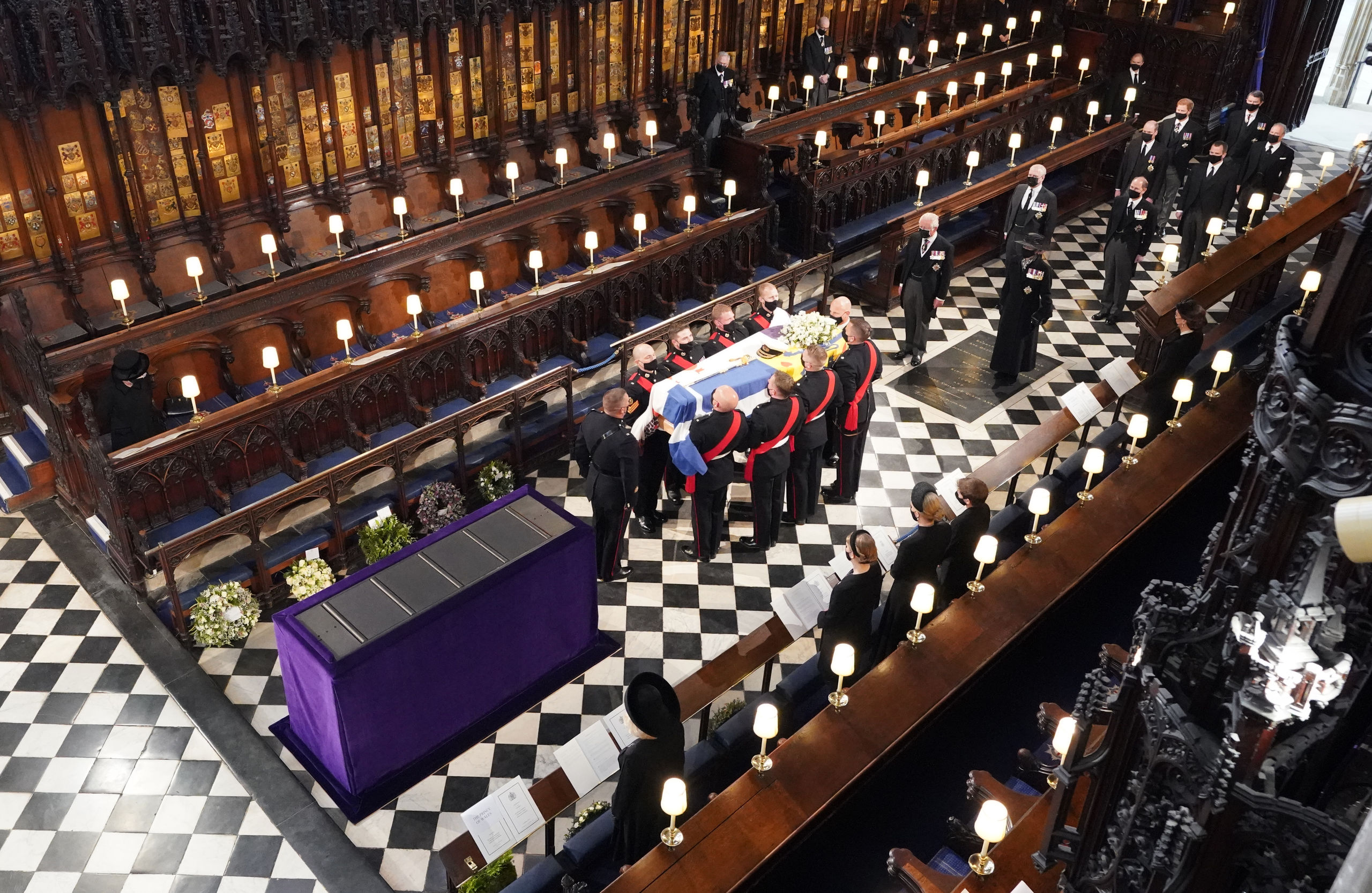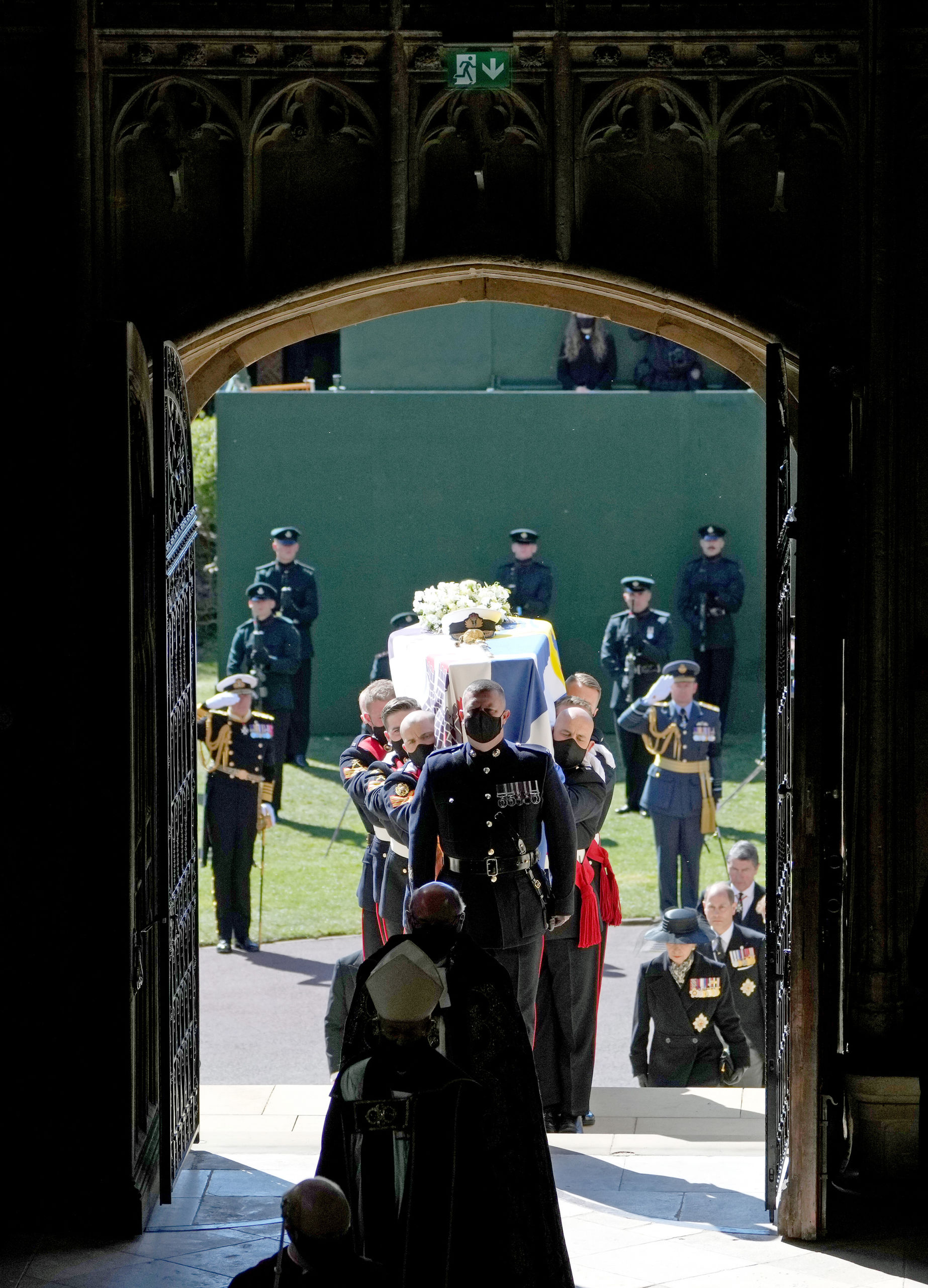 A las puertas de la capilla, el deán de Windsor y el arzobispo de Canterbury recibieron al féretro, que fue instalado sobre el catafalco mientras los asistentes, cubiertos todos con mascarillas, se dirigían a sus sitios asignados para mantener la distancia social.