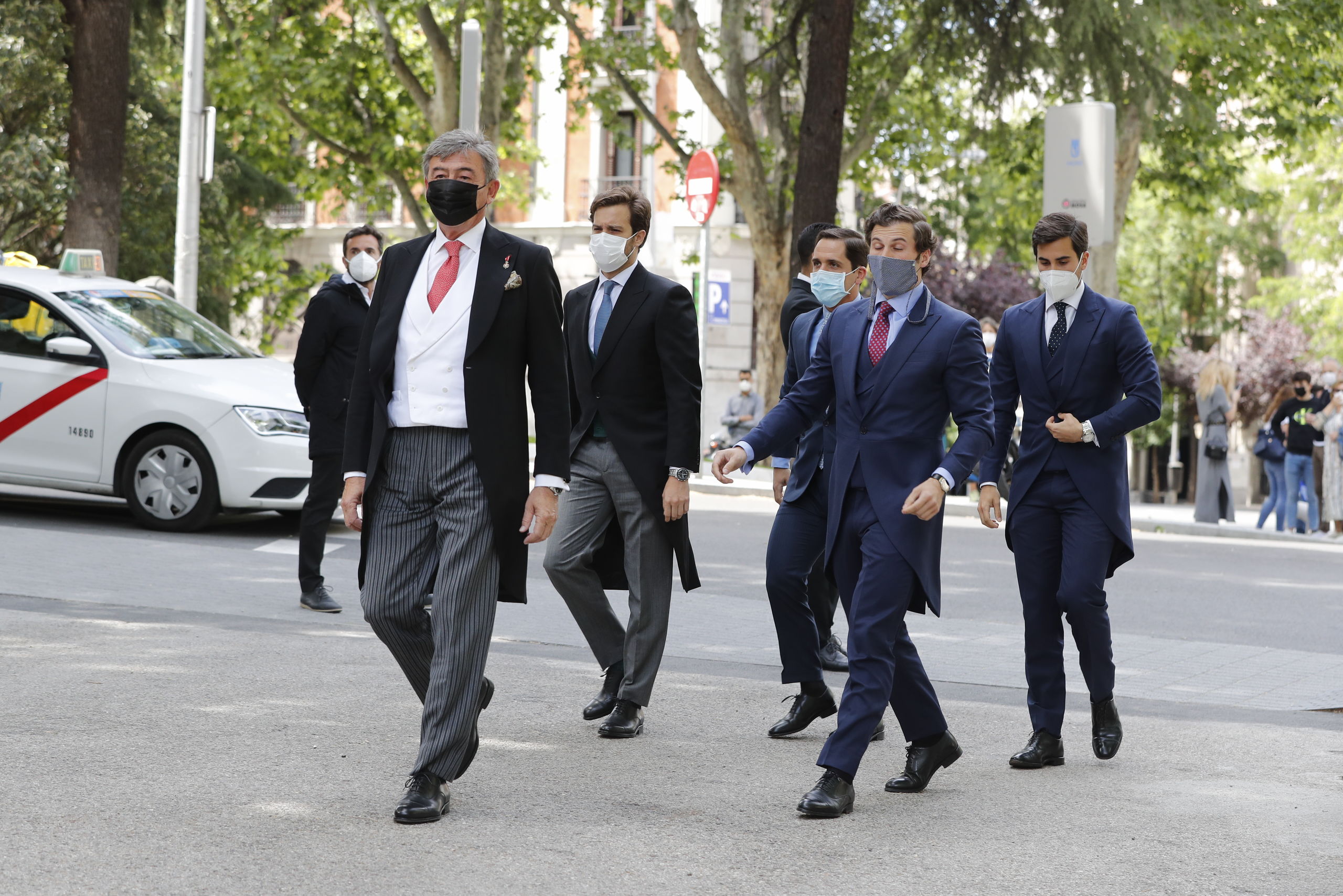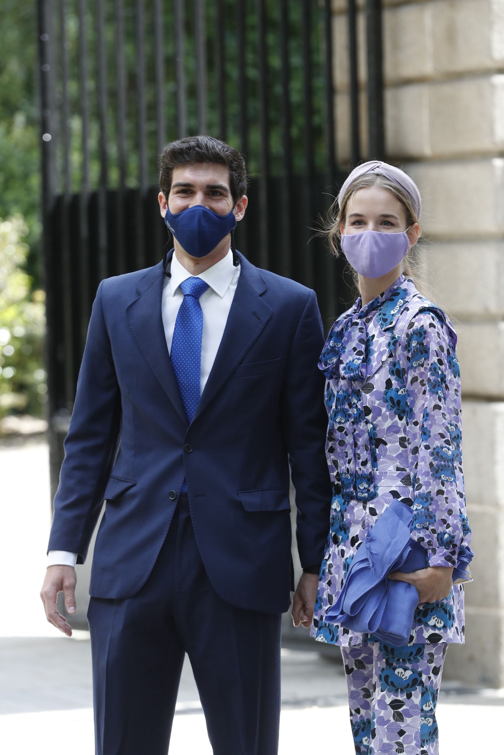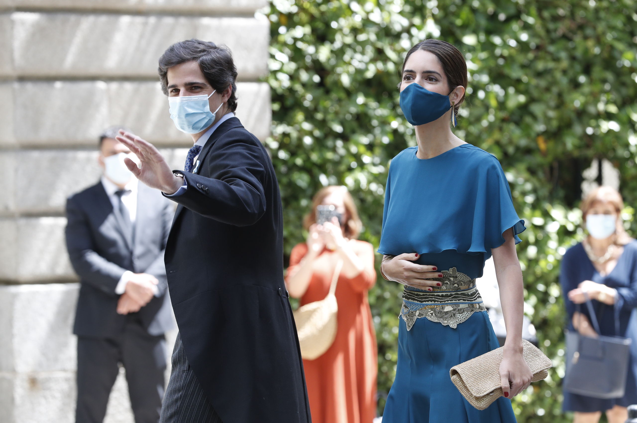 Desde primera hora el ambiente de felicidad se respira en las inmediaciones de Liria y aumenta según se va acercando el momento de la boda gracias a la llegada de los invitados. Todos ellos llevan puestas las mascarillas y algunas de ellas están personalizadas para la ocasión con flores o bordados para ir a juego con el look
