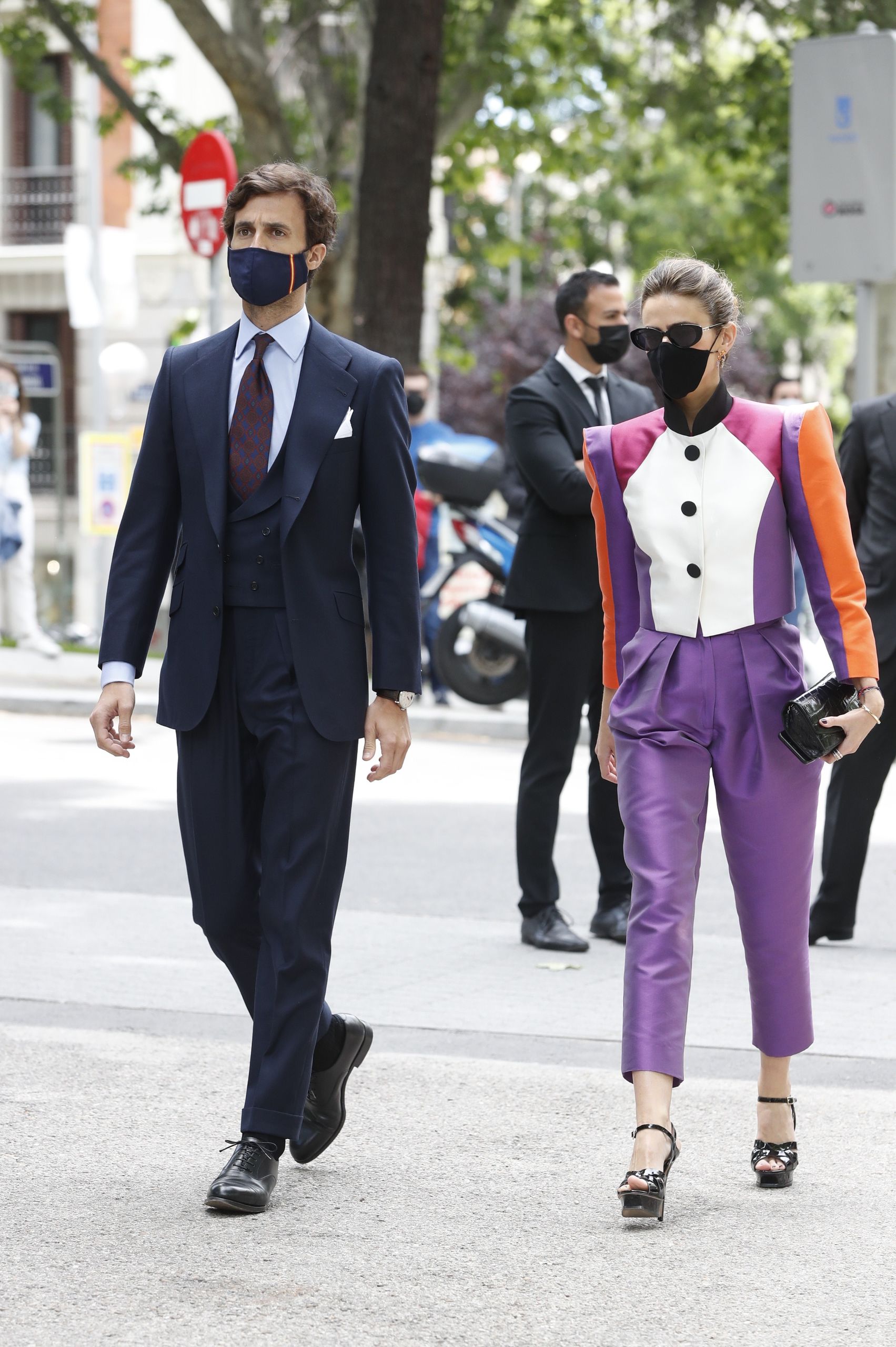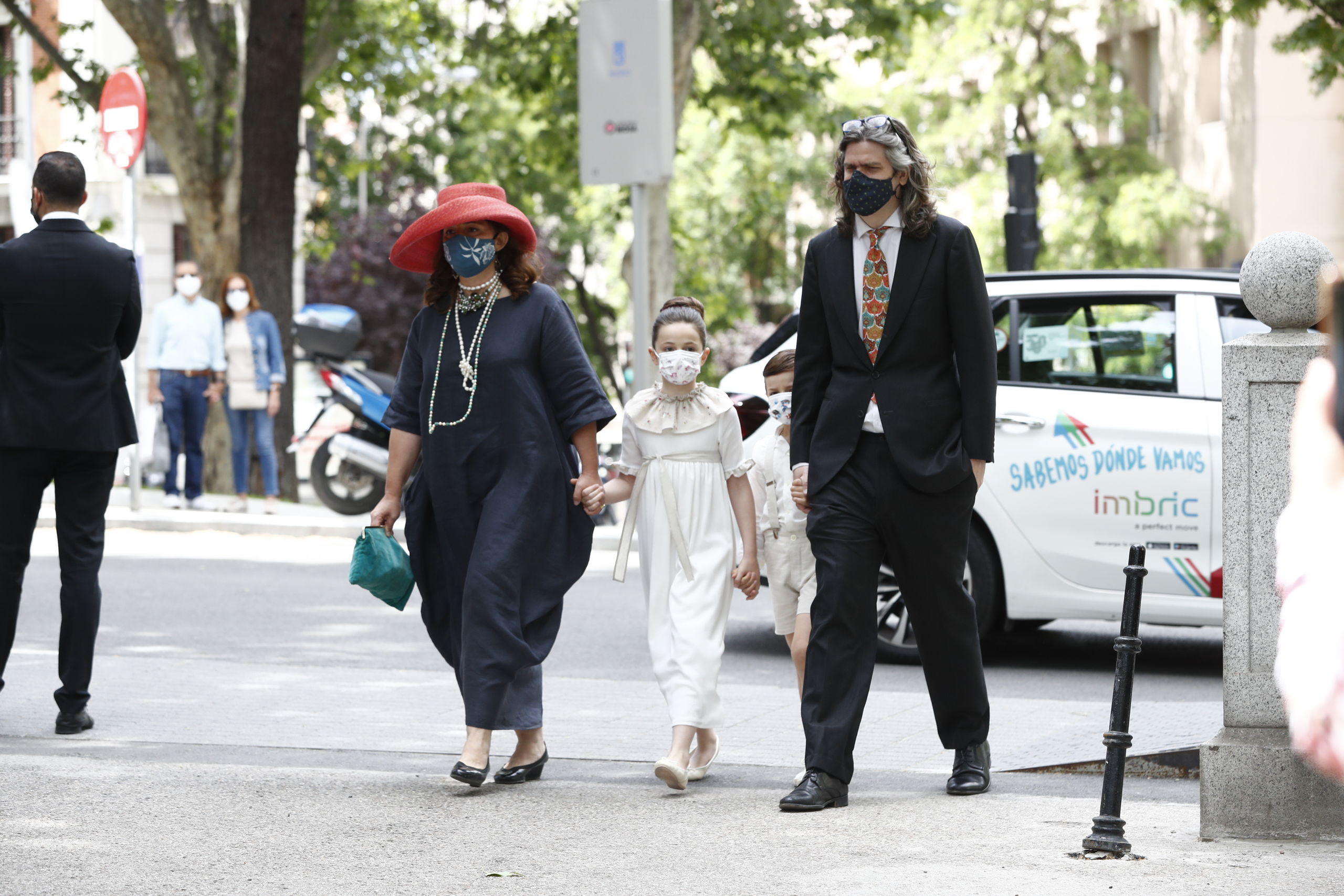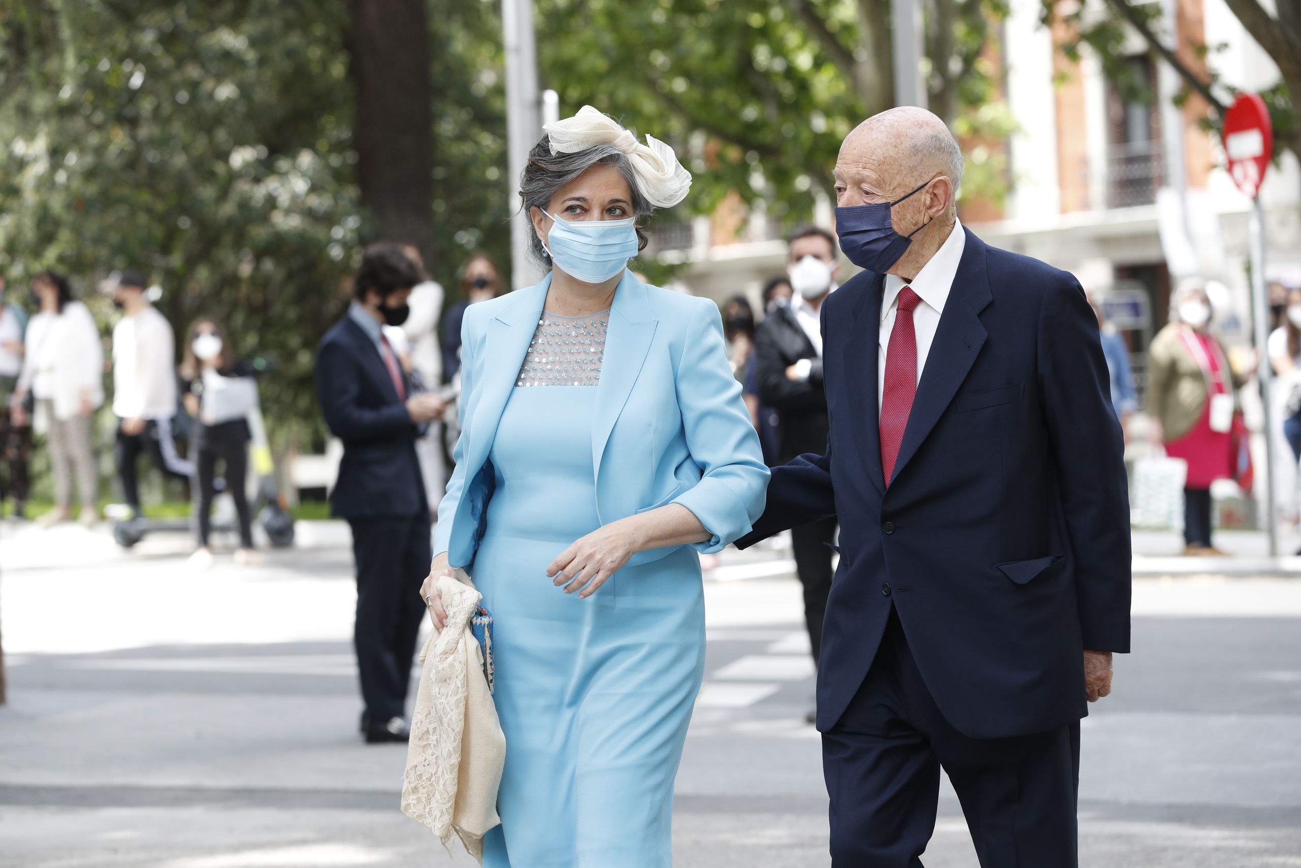 Desde primera hora el ambiente de felicidad se respira en las inmediaciones de Liria y aumenta según se va acercando el momento de la boda gracias a la llegada de los invitados. Todos ellos llevan puestas las mascarillas y algunas de ellas están personalizadas para la ocasión con flores o bordados para ir a juego con el look