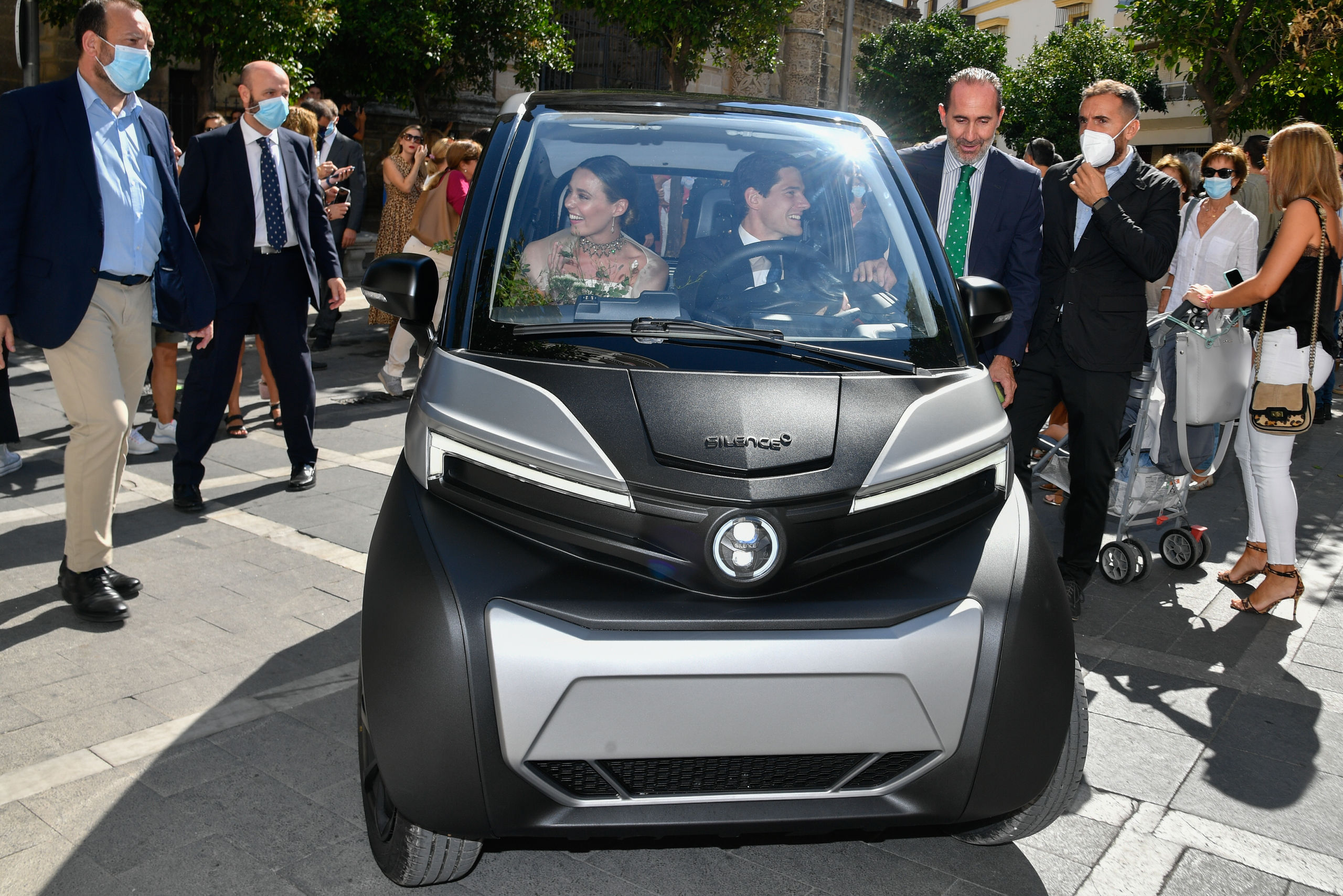 Los novios llegaron a la iglesia de una manera muy original. Su coche nupcial fue un eléctrico de Acciona.
