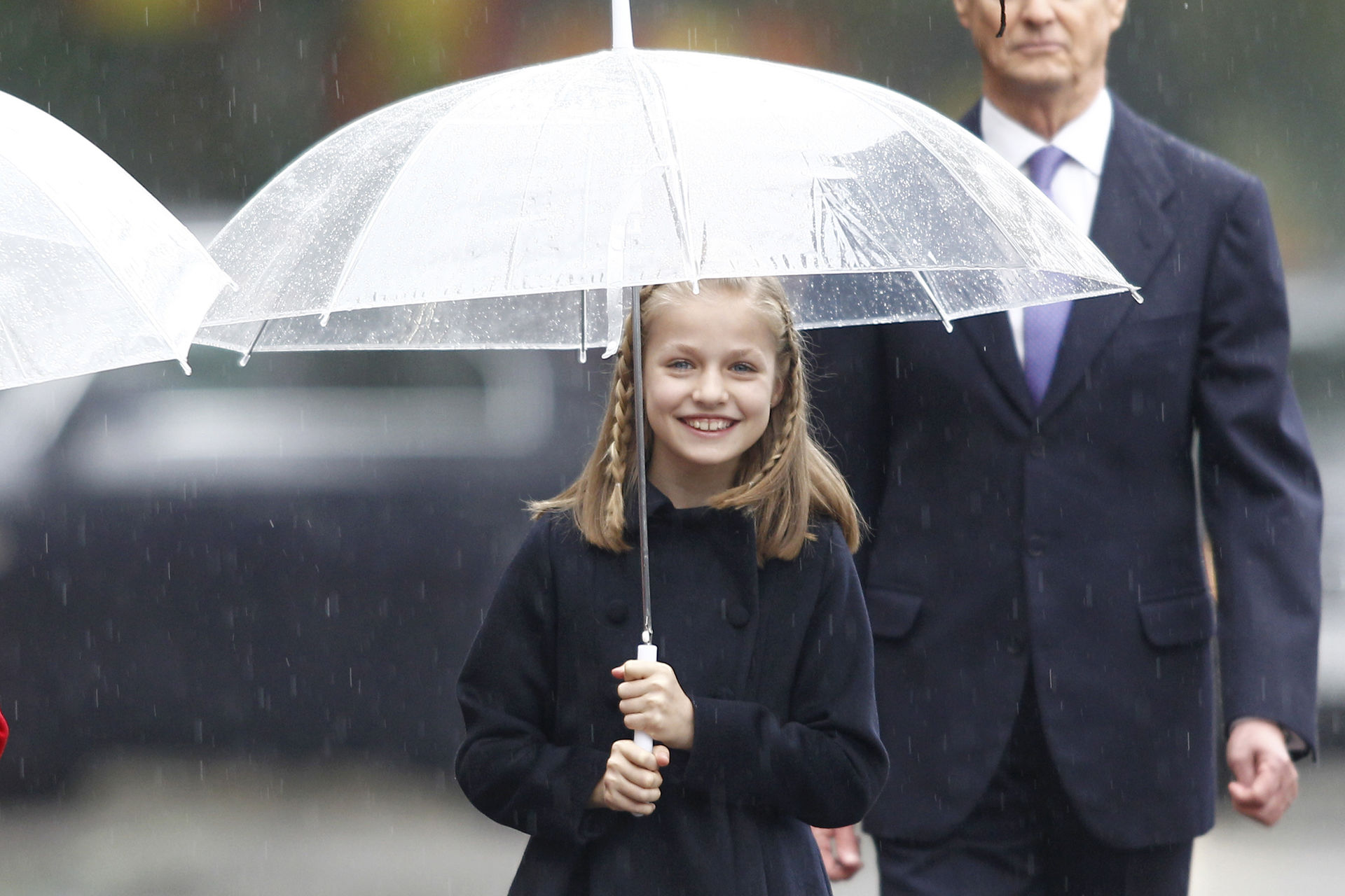 La princesa posa divertida para los fotógrafos a pesar de la lluvia antes de comenzar el desfile de la Fiesta Nacional el 12 de octubre de 2017.